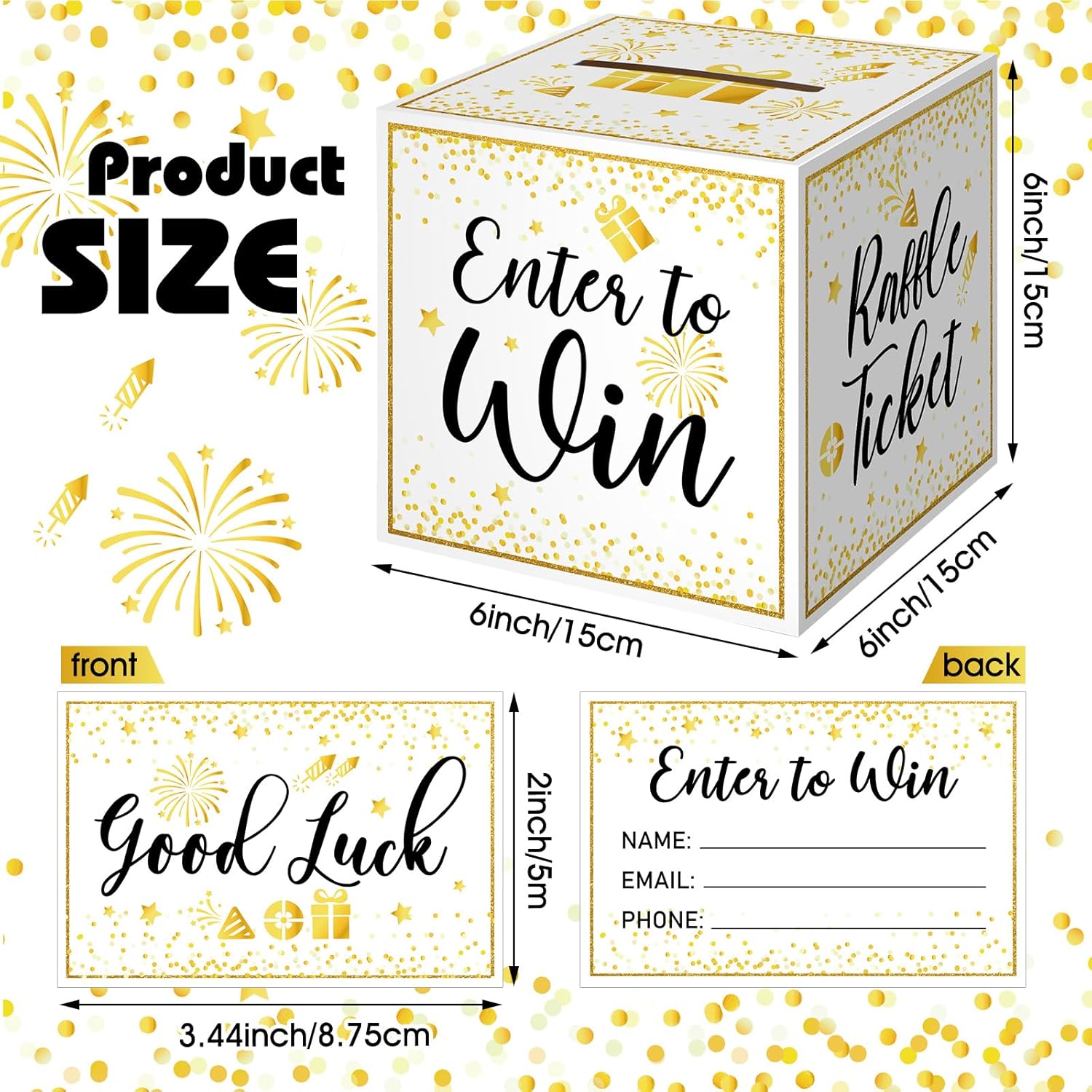 - Delicate and Well Matched: each voting box with slot comes with 100 raffle tickets and each card has a gold confetti design and a [good luck] wish on the front; There is a place on the back for people to fill in their name, email and phone number to facilitate the entry of relevant information at the event, and the box is printed with various gold patterns, attractive and stylish