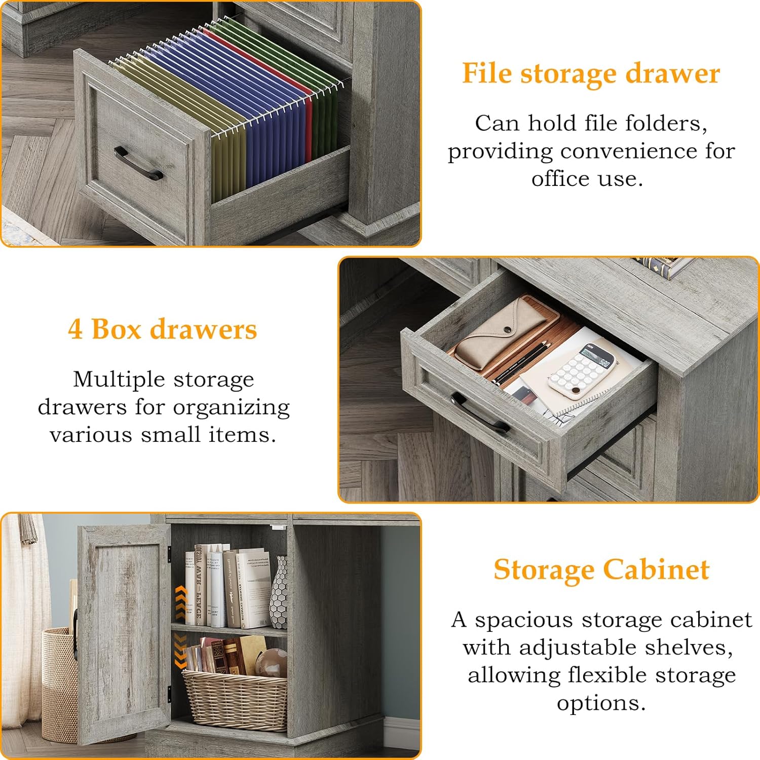 - 【Abundant Storage Capacity】This large executive desk, 61" wide and 67" tall, provides plenty of space for files, computers, and printers. It has five drawers, including dedicated file drawers that can hold both letter and A4-sized documents. There are also roomy storage cabinets, offering an organized way to keep files, books, and other necessities.