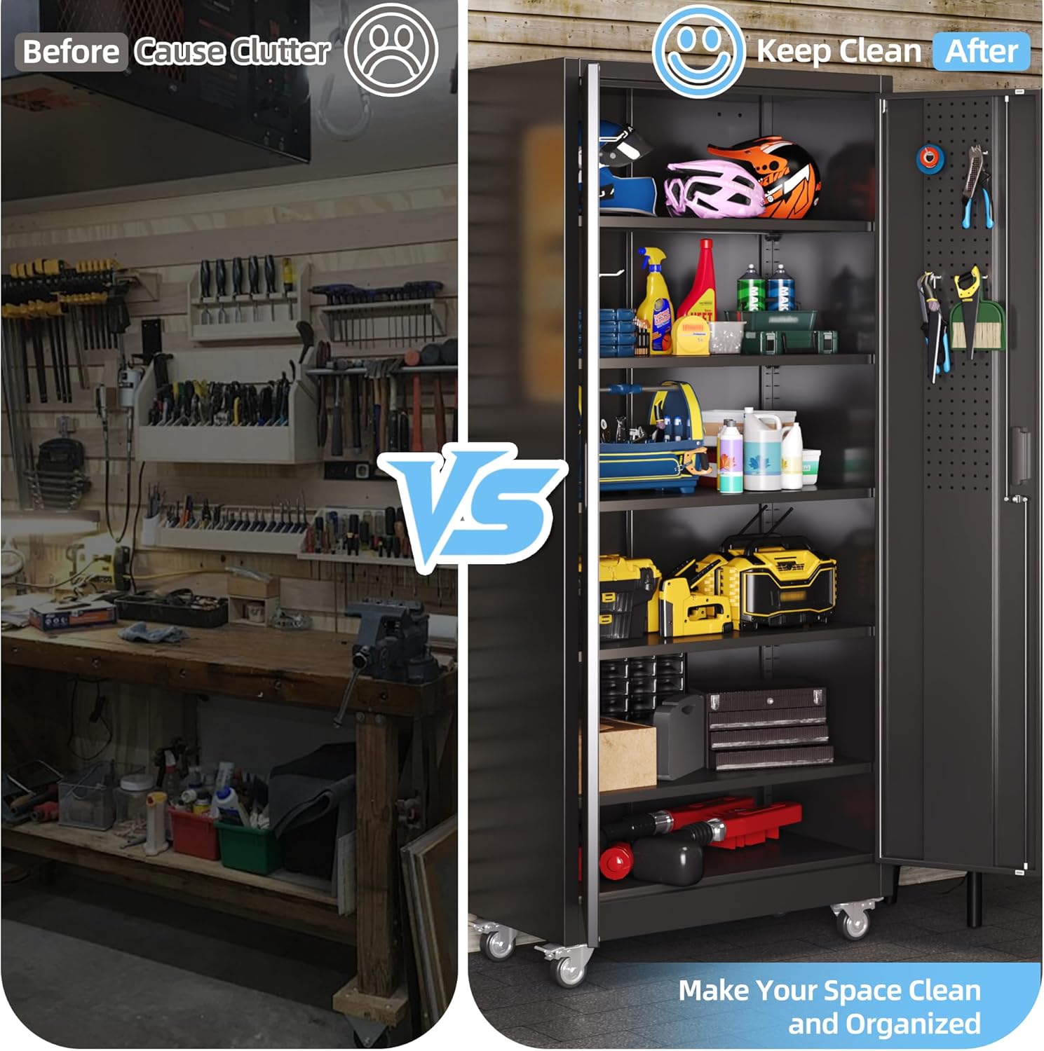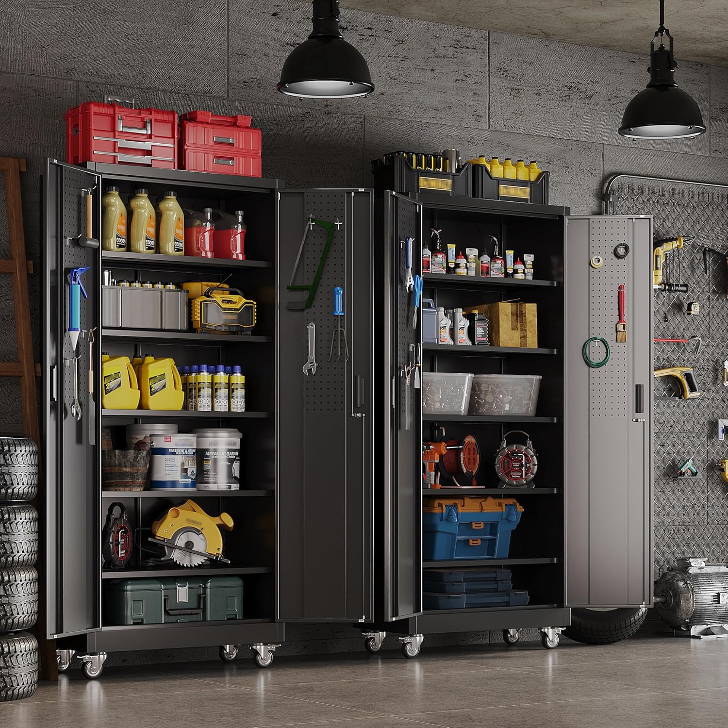 - [Garage Storage Cabinet] Plenty of storage. "great garage cleanup".You can move them around as needed and the casters and wheels work great on all the different surfaces inyour garage. Extra storage strong and fit your needs, it is sufficient for garage use.