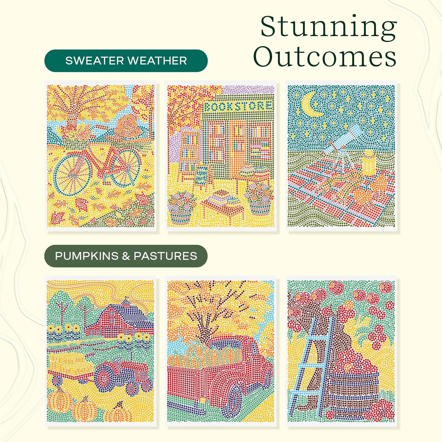 - Create Charming & Cozy Fall Scenes: Pack includes 2 full-sized Dot-By-Letter activity pads in Pumpkins & Pastures and Sweater Weather, each with 20 meditative scenes and 4 double-sided markers in a detachable storage tray. The snap-in storage tray keeps your makers securely attached to the book, so you’ll never lose them, and everything stays together for easy, on-the-go fun!