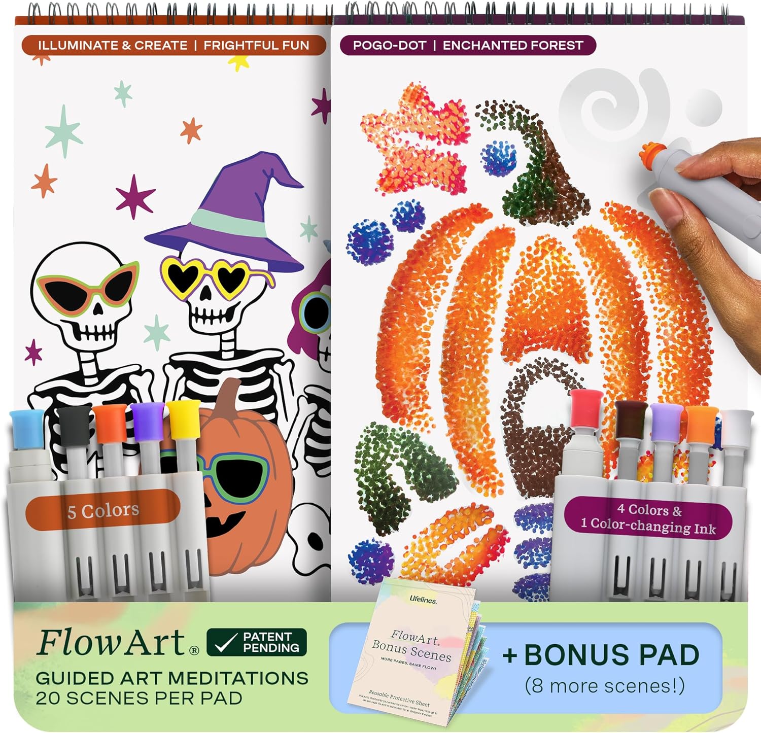 - PATENT PENDING, INNOVATIVE ACTIVITY PADS: Get into a calming flow state. This Lifelines Fall FlowArt 2-Pack includes two full-sized activity pads in Illuminate & Create and Pogo-Dot, and a bonus activity pad with eight more captivating scenes! 10 markers also included.