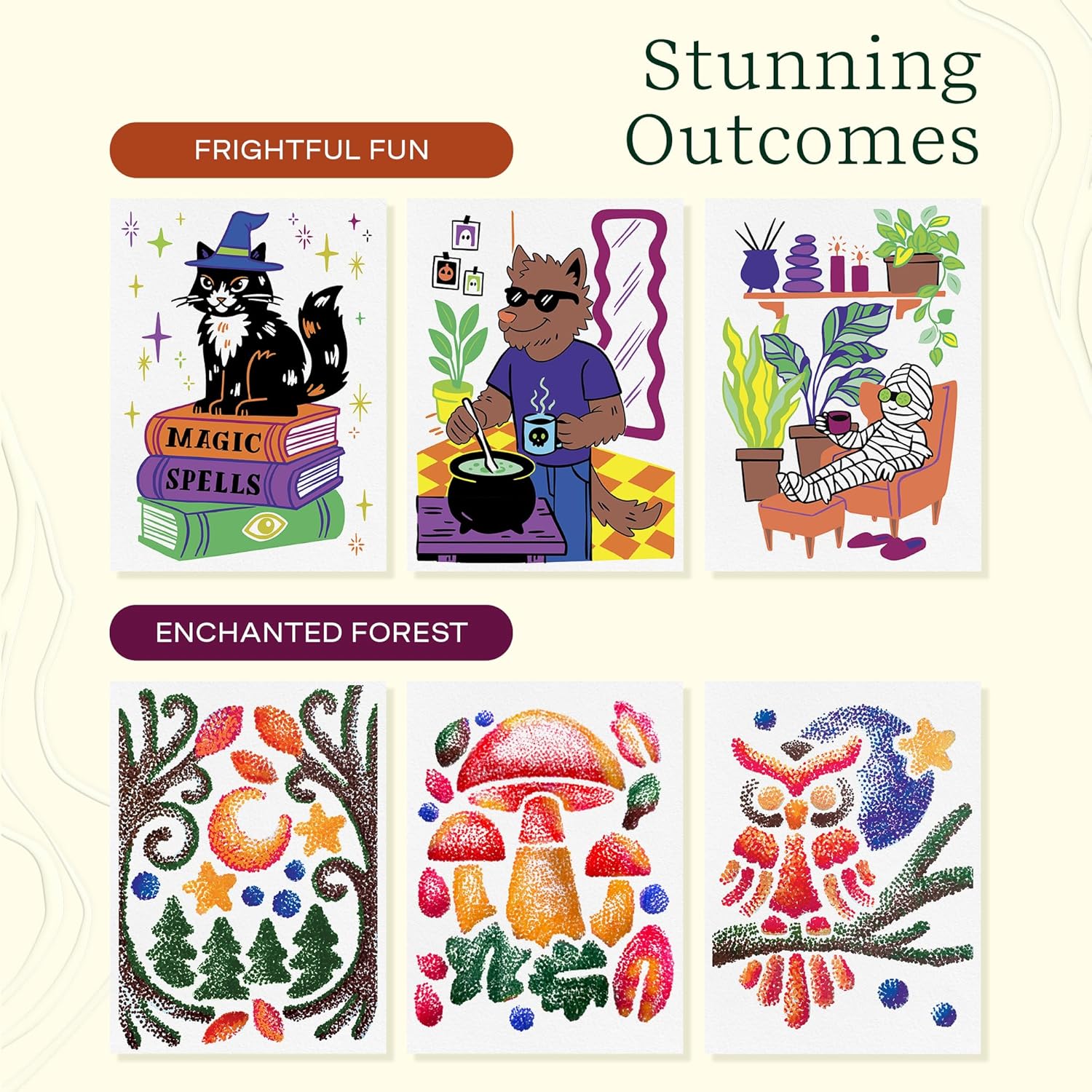 - Create Frightfully Fun & Enchanting Fall Scenes: Each full-sized activity pad includes 20 meditative scenes and a set of unique markers in a detachable storage tray. The snap-in storage tray keeps your makers securely attached to the book, so you’ll never lose them, and everything stays together for easy, on-the-go fun!