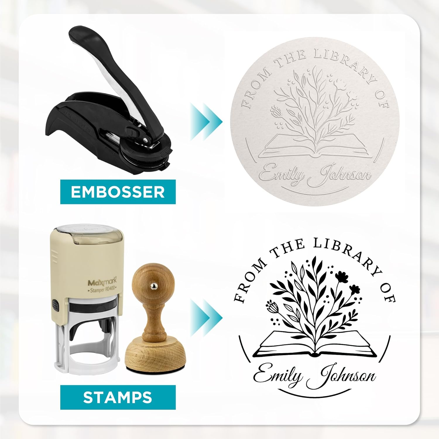 Custom Library Embosser - Style 112 - Embosser, Wood Stamp or Self Inking Stamp - Book Embosser Includes 50 Gold Seals - Custom Stamp Seal from The Library of