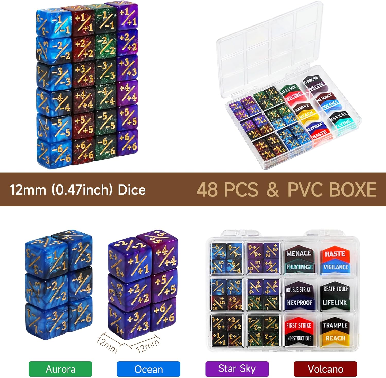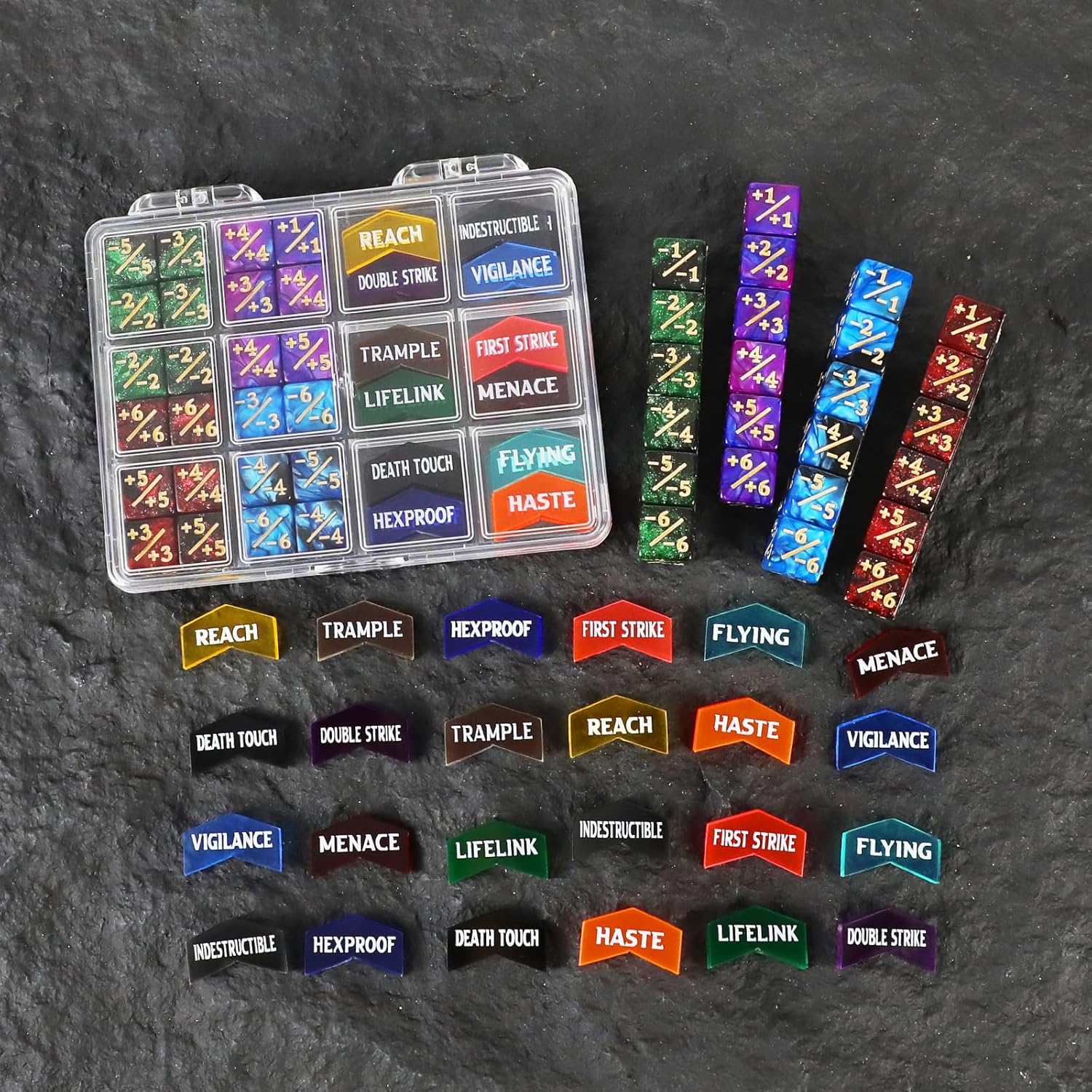 - PACKAGE INCLUDED - Comes with 24pcs MTG tokens & 24pcs MTG dice set. MTG tokens include 2x First Strike, 2x Double Strike, 2x Indestructible, 2x Hexproof, 2x Haste, 2x Reach, 2x Lifelink, 5x Deathtouch, 2x Menace, 2x Trample, 2x Flying, 2x Vigilance. Dices include 24pcs 12mm dice counters(12pcs -1~-6 & 12pcs +1~+6). Note: Product includes counters and dices only.
