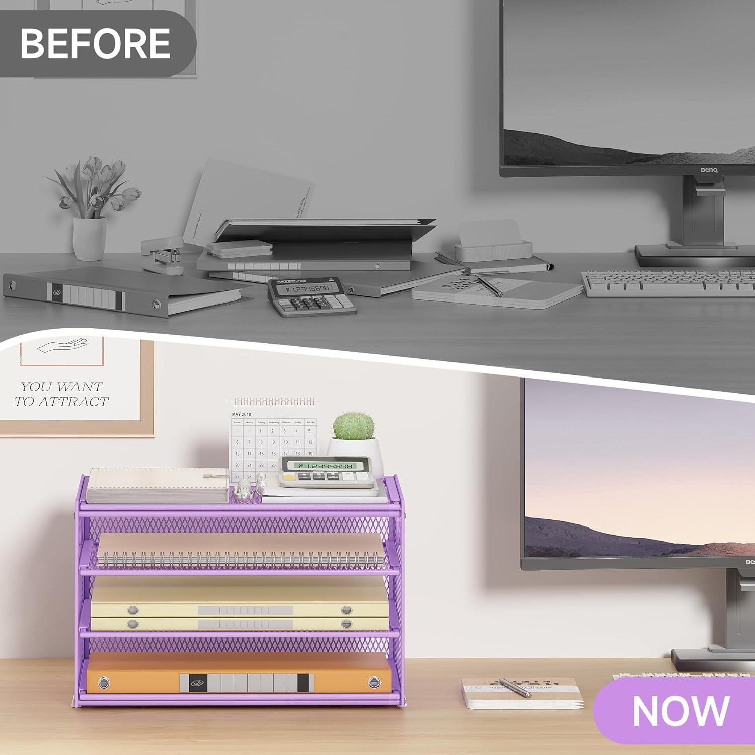 Subekyu Paper Letter Tray Organizer for Desk, Purple Metal Mesh Desk File Sorter Organizer with Handle and 2 Sliding Trays for Home Office School Supplies Organization