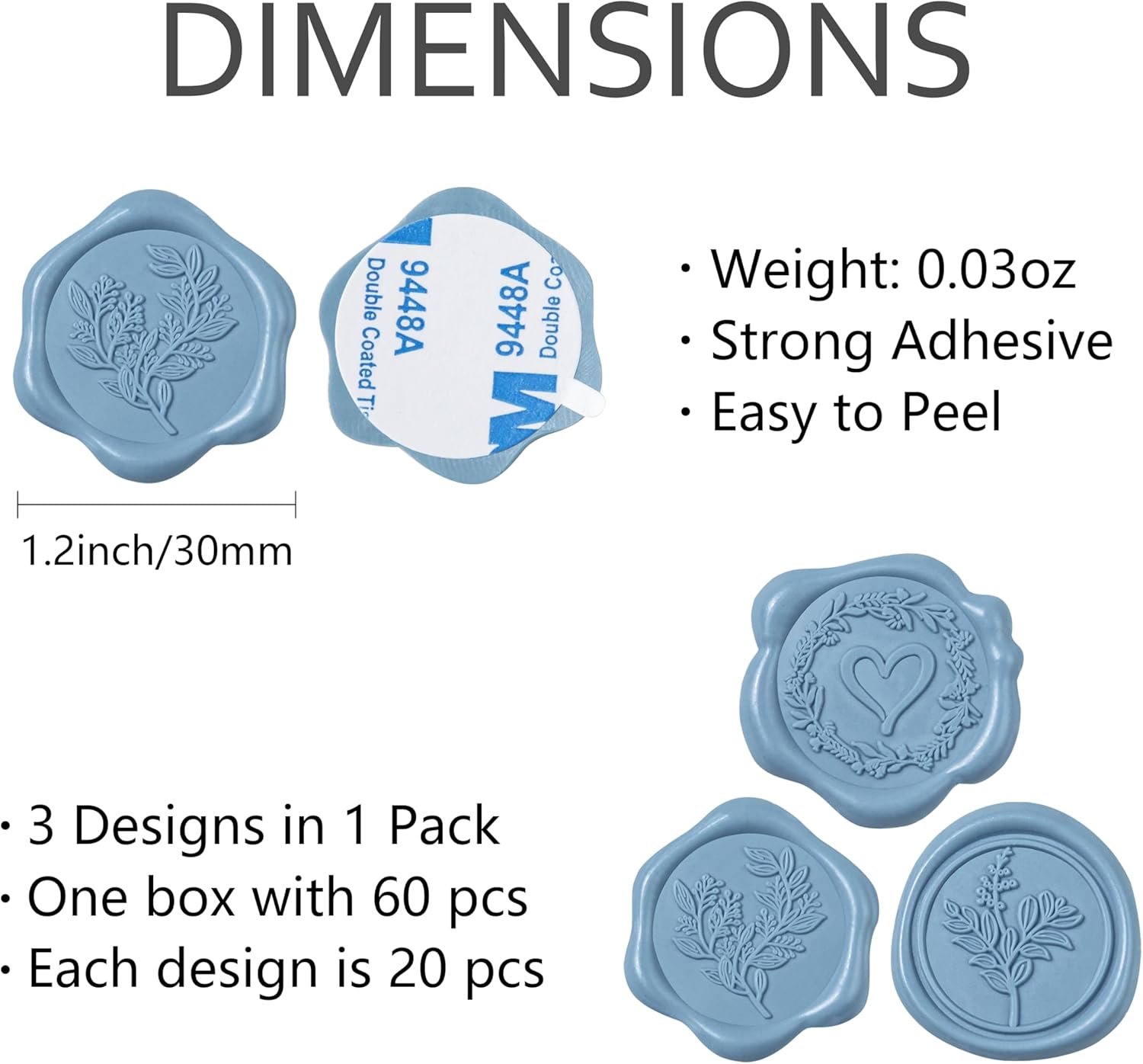 60 Pcs Dusty Blue Wax Seal Stickers Self-Adhesive Envelope Seals Stamp Stickers, Perfect for Wedding Invitations Seating Chart Christmas Gift Wrapping 3 Designs in 1 Pack