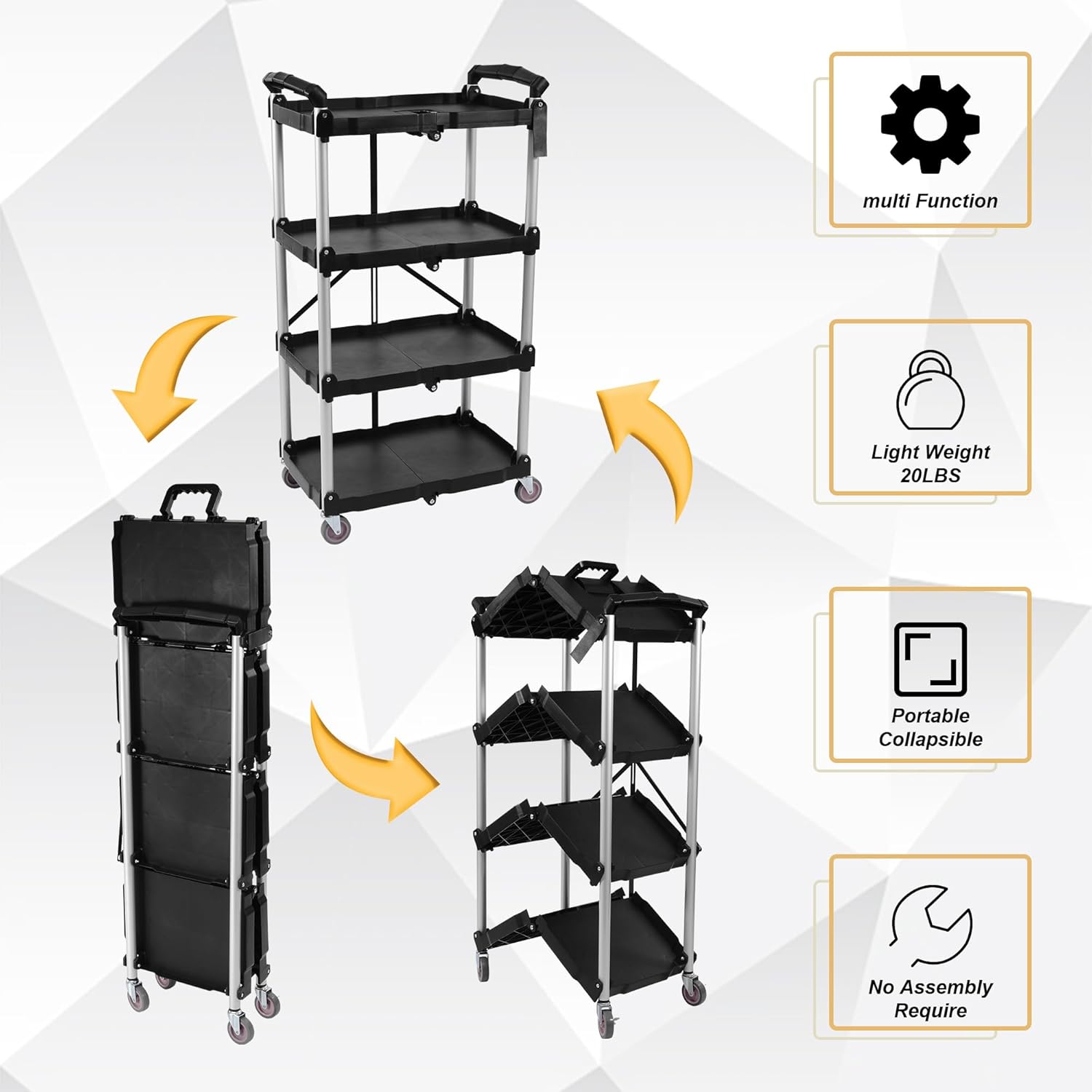 Folding Utility Cart, Portable Collapsible Service, 4 Shelf Heavy Duty Collapsible Tool with Wheels, Suitable for Office Warehouse Home, Black
