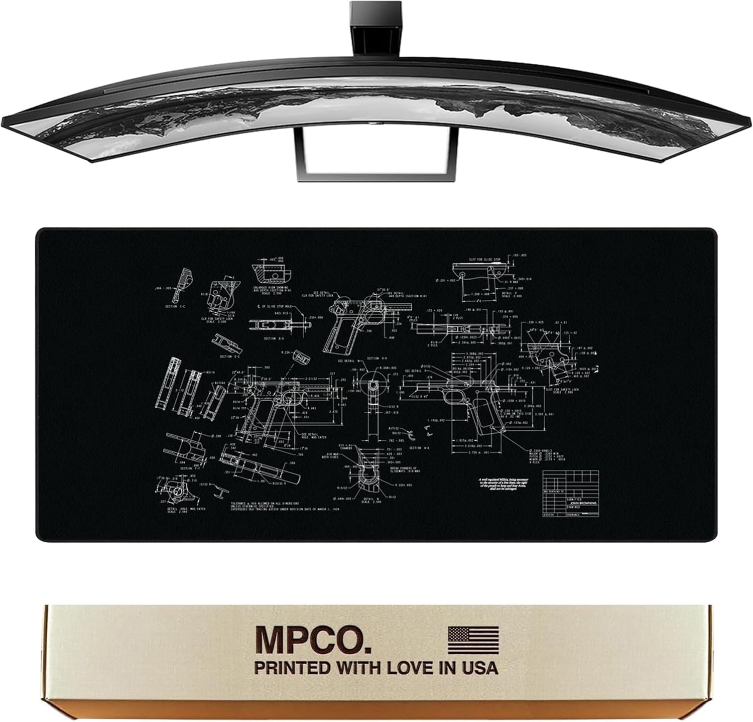 MPCO. Blueprints Large Gaming Desk Pad - 36" x 17" Aeroglyde Fabric Browning 1911 – Black Desk Mats - Non-Slip, Washable, Smooth Glide for Precision Gaming & Work