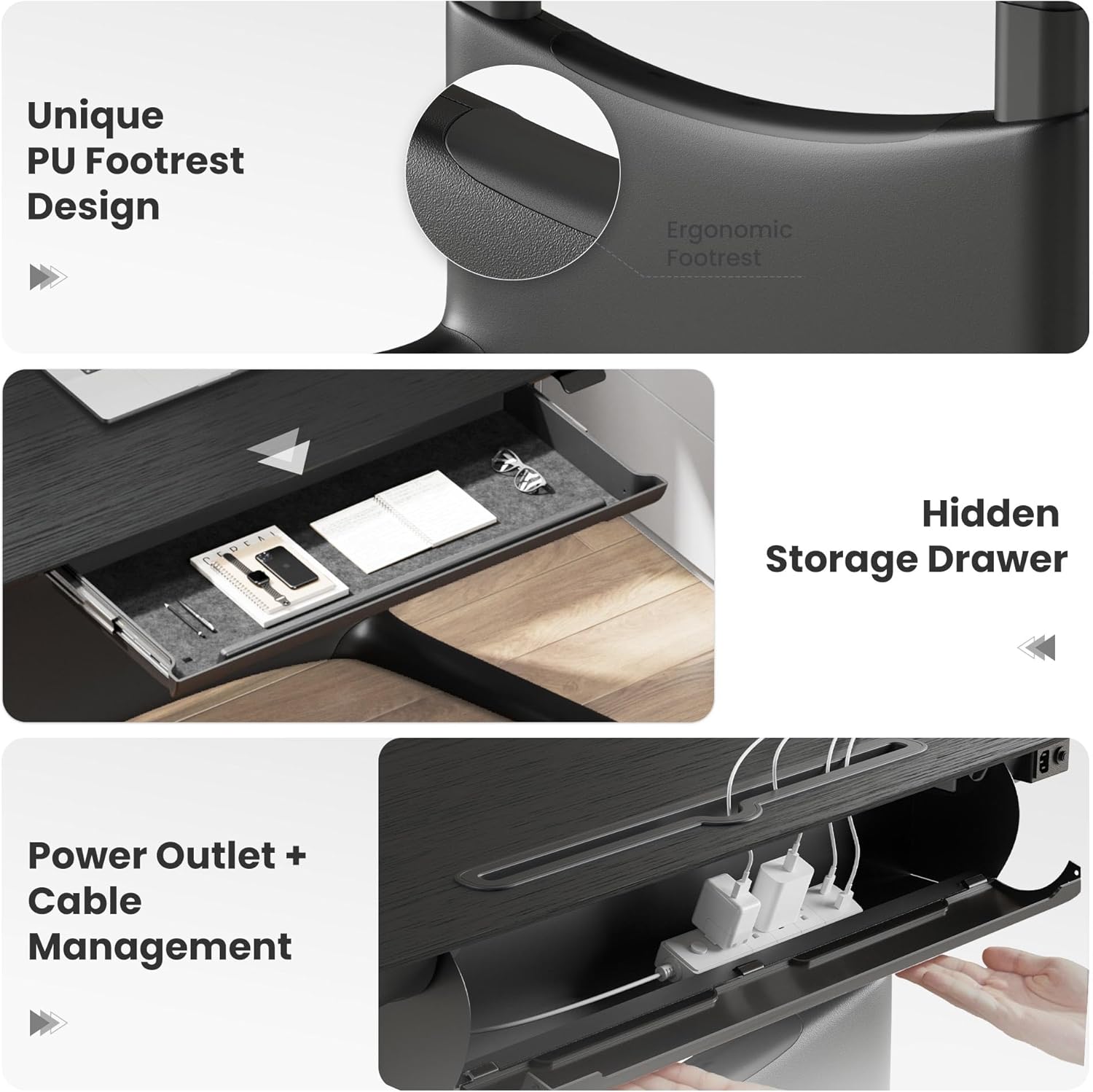 - ăErgonomic Footrest for Flexible PostureăWhether sitting, standing, lounging, or cross-legged, the built-in footrest supports your legs in any position. Reduce pressure, enhance comfort, and boost productivity.