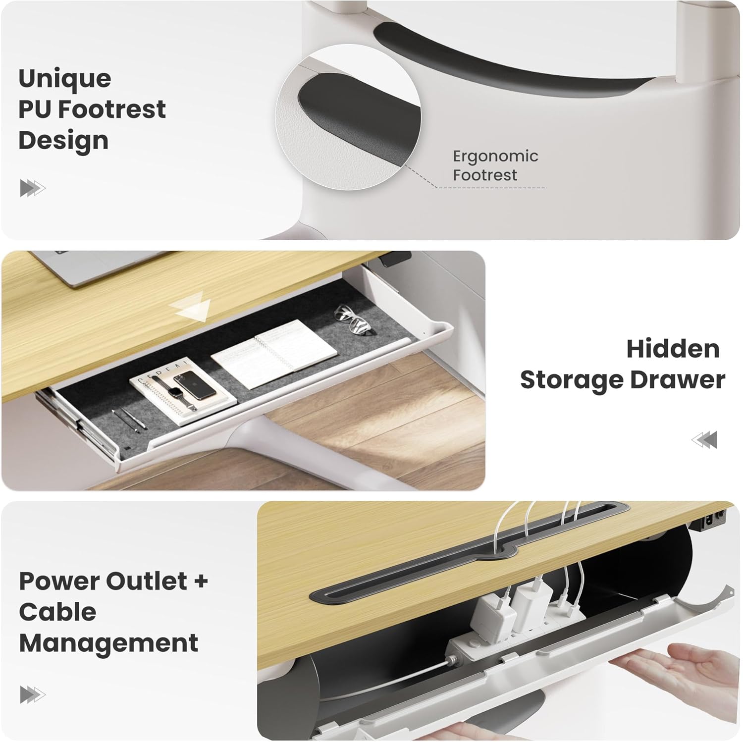 COLAMY Electric Standing Desk, Whole-Piece Gaming Desk with Dual Motors, Ergonomic Footrest, Drawers for Storage, Adjustable Height Sit-Stand Desk for Home Office (MFC Desktop, Light Maple + White)
