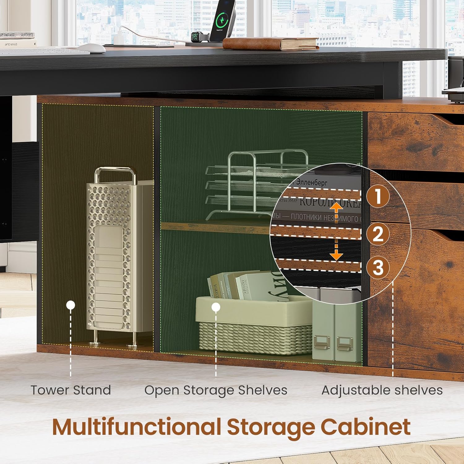 SEDETA 71" Executive Desk with File Cabinet, Large Office Desk with Drawers and Shelves, L Shaped Computer Desk with Power Outlets, Business Furniture Desk Workstation for Home Office, Brown