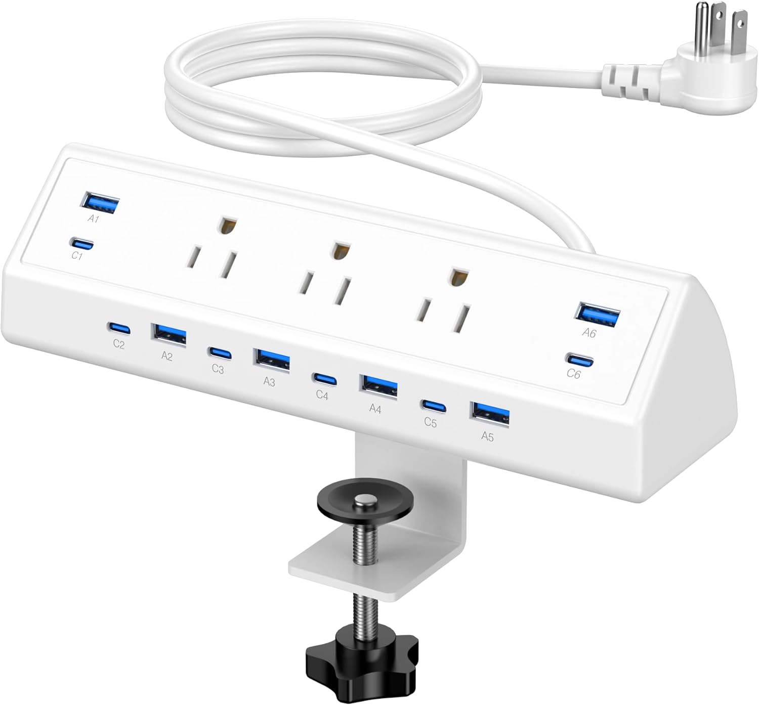 - Secure & Space-Saving Desk Clamp Mount:Our clamp design installs in seconds without tools, securely fastening to desks up to 1.96 inches thick. Free up valuable desk space and prevent cords from being knocked back into a tangled mess. Enjoy a clean, permanent charging solution that keeps cables organized and within easy reach.