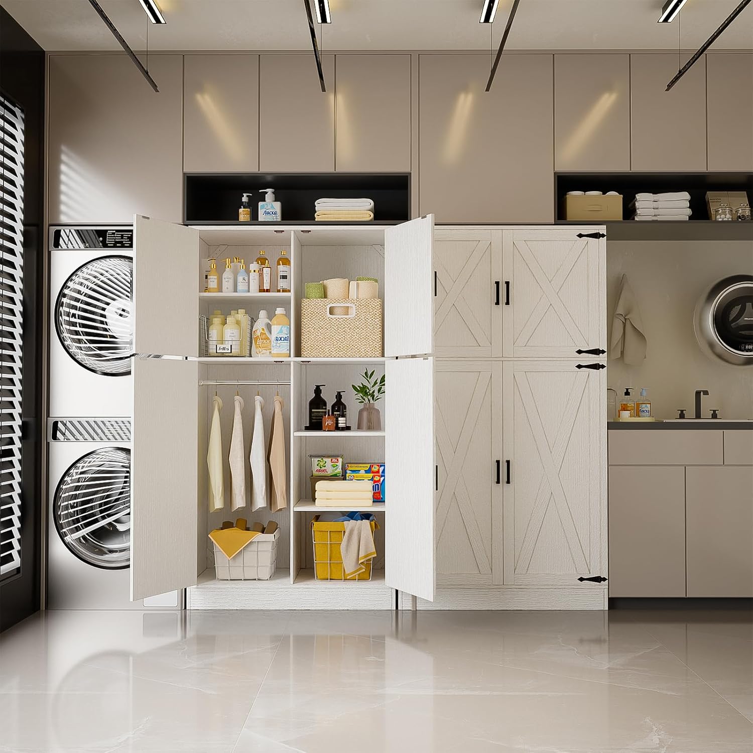 - 【Elegant Wardrobe Closet】Our tall wardrobe closet features a farmhouse style with classic barn doors, black metal handles and accents, perfectly blending a modern country aesthetic with the warmth of a vintage farmhouse, complementing a variety of decor styles in your living space.