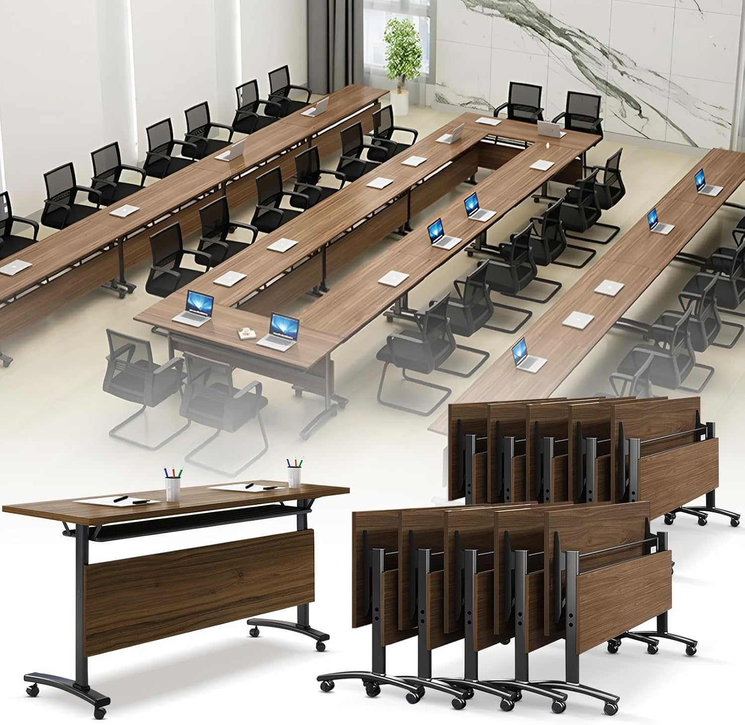 Folding Conference Room Table, Modern Conference Tables with Wheels, Large Rectangular Mobile Training Tables for Office Classroom, Foldable Modular Boardroom Seminar Table Walnut (10pack L55.1in)