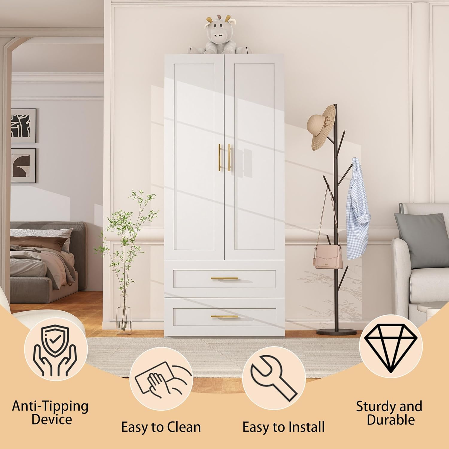 White Wardrobe with 2 Doors: 75" Tall Armoire Wardrobe Closet with 2 Drawers, Bedroom Closet Cabinet for Hanging Clothes, Wooden Storage Armoire with Shelves (Contemporary, 1)