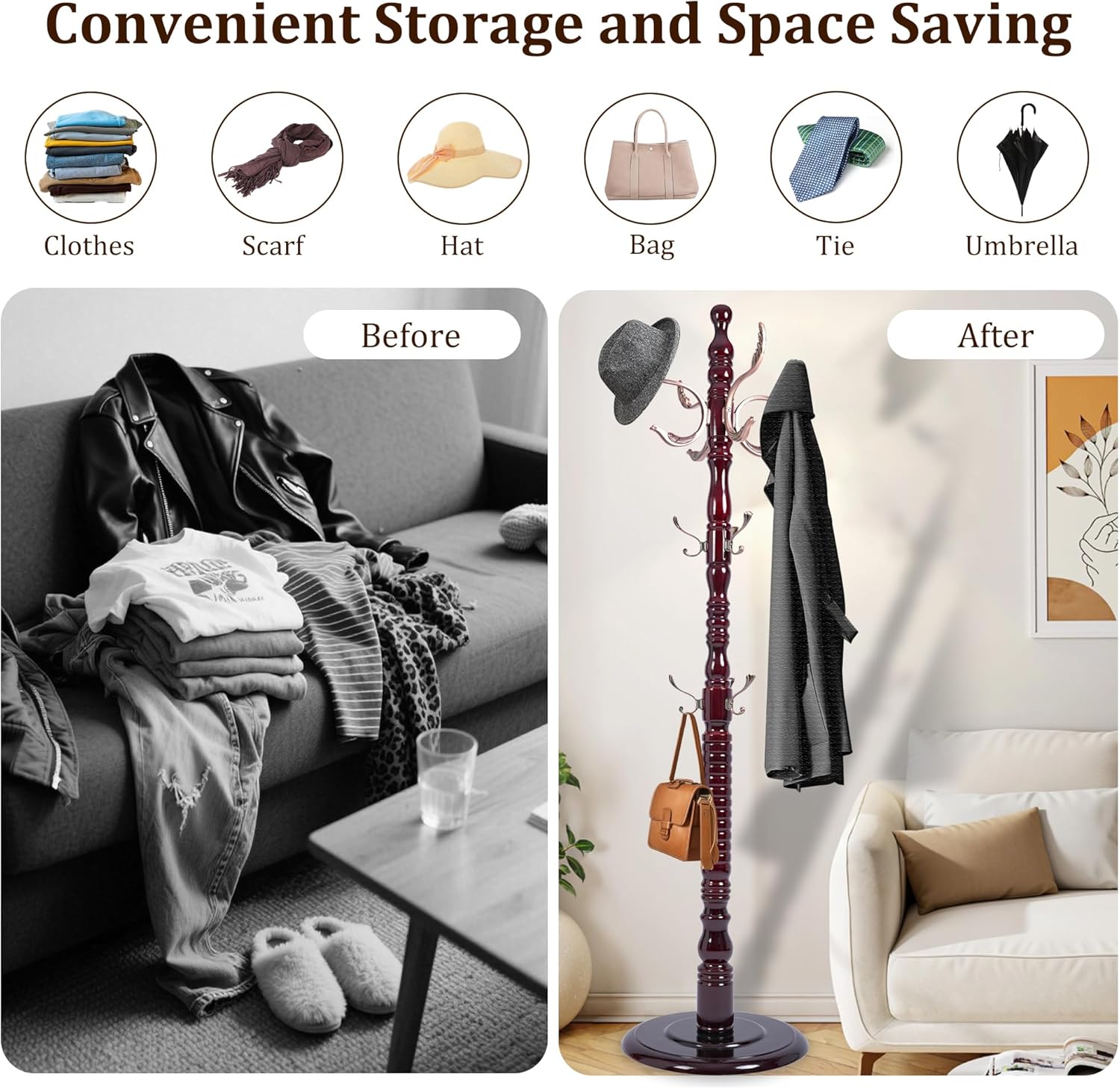 - 【HIGH QUALITY MATERIAL】This modern coat rack crafted from high-quality solid rubberwood, adopt polishing techniques, coated with eco-friendly paints, ensures durability and a stylish addition to any room, perfect for organizing your wardrobe essentials. It fits into living rooms, entryway, bedrooms, offices, and apartment