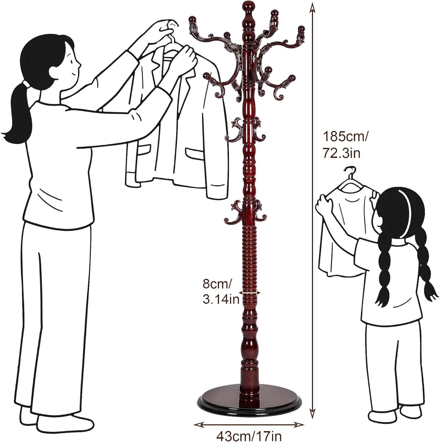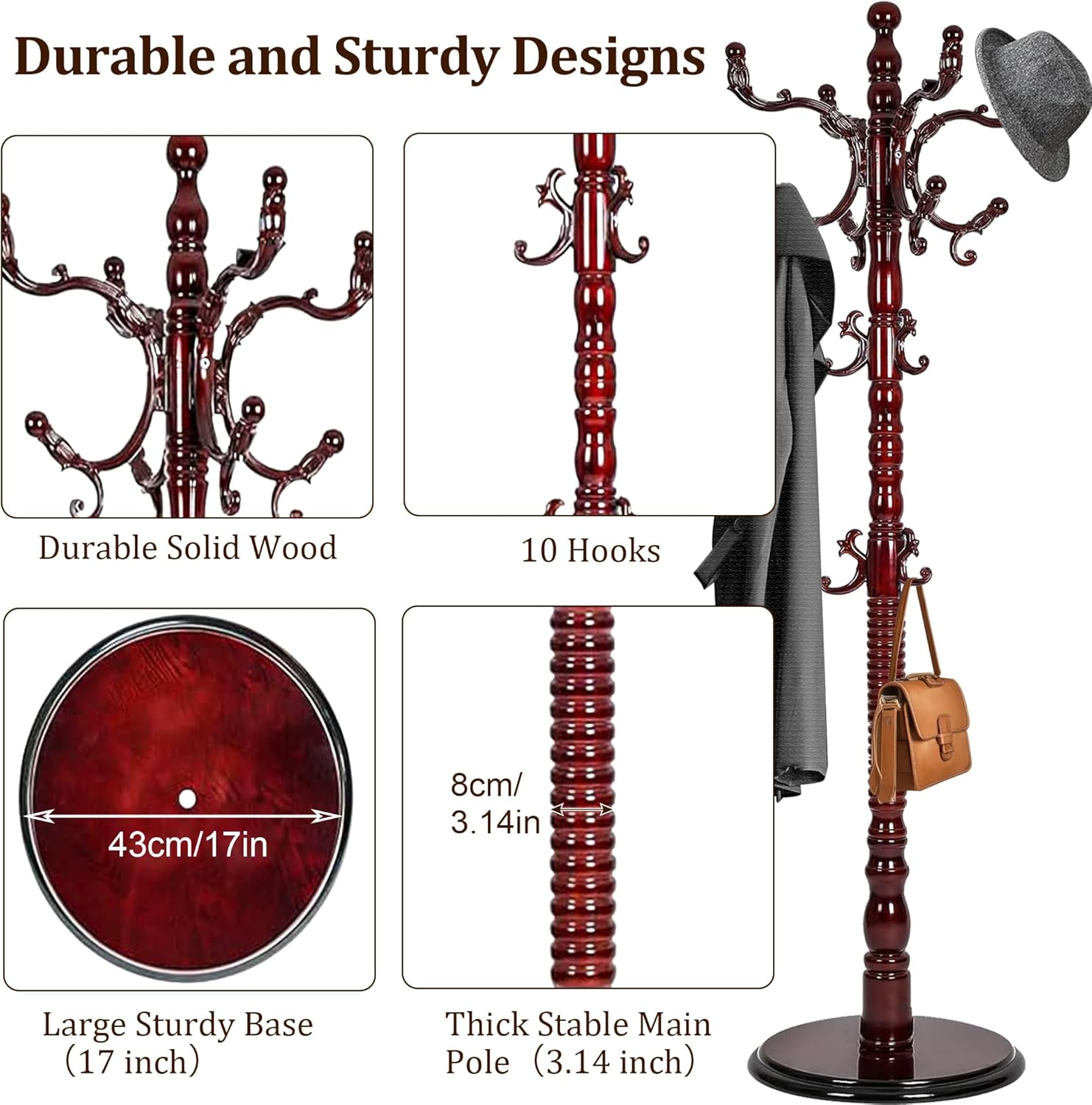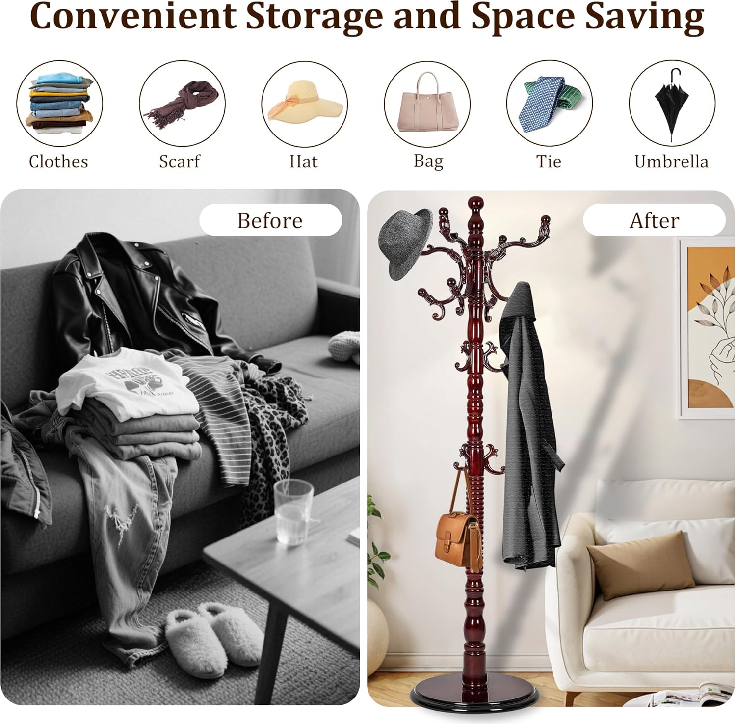 - 【HIGH QUALITY MATERIAL】This modern coat rack crafted from high-quality solid rubberwood, adopt polishing techniques, coated with eco-friendly paints, ensures durability and a stylish addition to any room, perfect for organizing your wardrobe essentials. It fits into living rooms, entryway, bedrooms, offices, and apartment