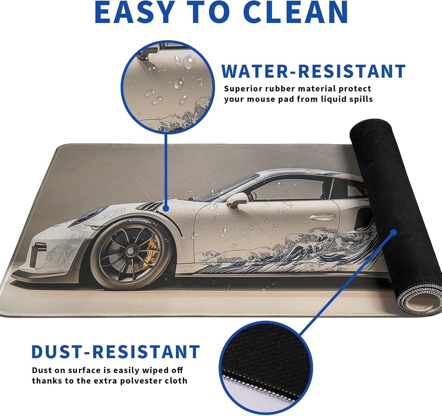 - β₯[Easy To Clean]:This large White Ukiyo-e Style Sports Car mouse pad for desk, Spill-proof coating protects your desktop from spilled water, Drinks, Ink and the other liquid spilled liquid or other accidents. Easy to clean, Just wipe with a wet cloth or paper, Does not fade and can be washed and foldable without leaving creases, Easy to carry.