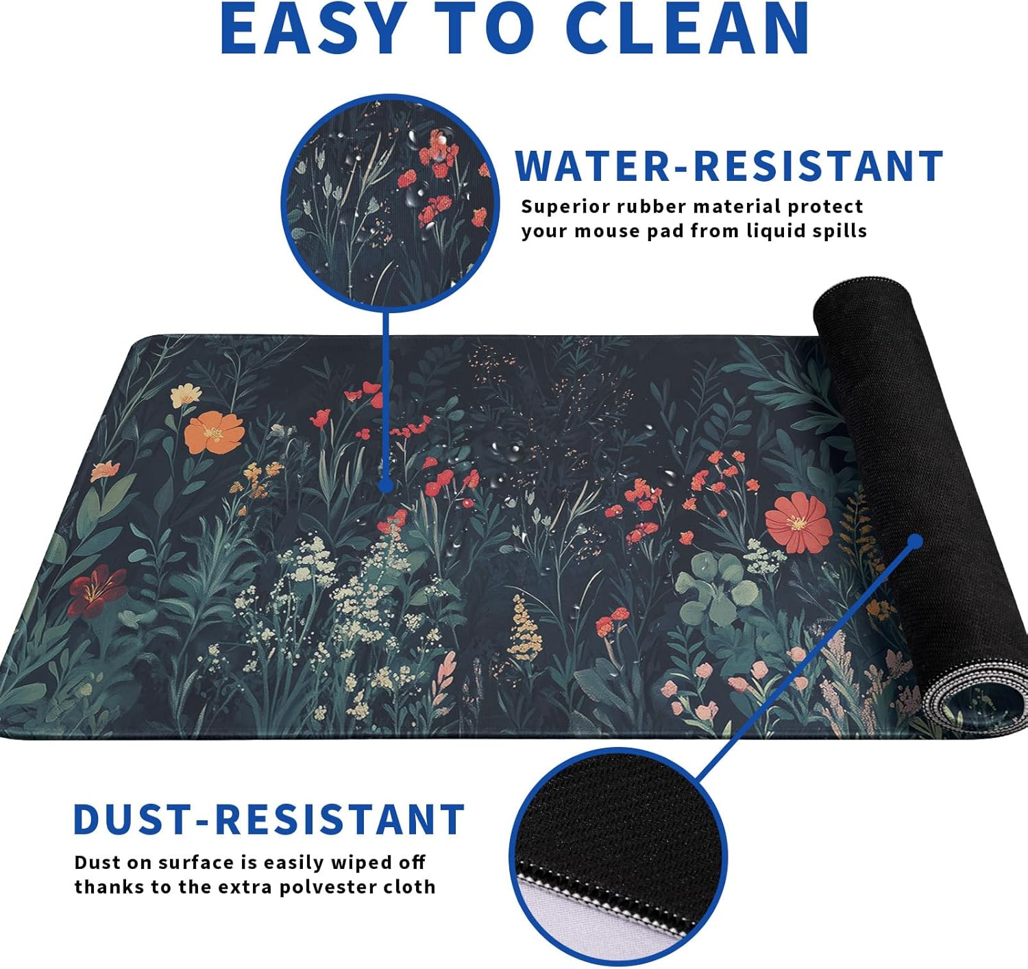 - β₯[Easy To Clean]:This large Flower mouse pad for desk, Spill-proof coating protects your desktop from spilled water, Drinks, Ink and the other liquid spilled liquid or other accidents.Easy to clean, Just wipe with a wet cloth or paper, Does not fade and can be washed and foldable without leaving creases, Easy to carry.