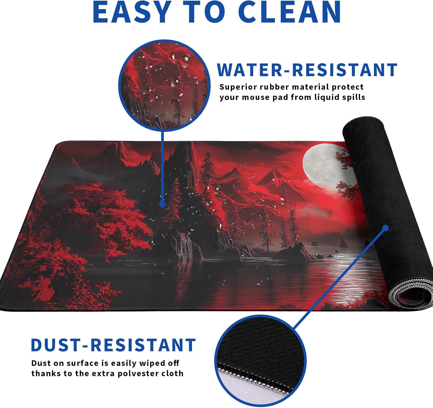 - β₯[Easy To Clean]:This large Darkness Red Moon mouse pad for desk, Spill-proof coating protects your desktop from spilled water, Drinks, Ink and the other liquid spilled liquid or other accidents. Easy to clean, Just wipe with a wet cloth or paper, Does not fade and can be washed and foldable without leaving creases, Easy to carry.