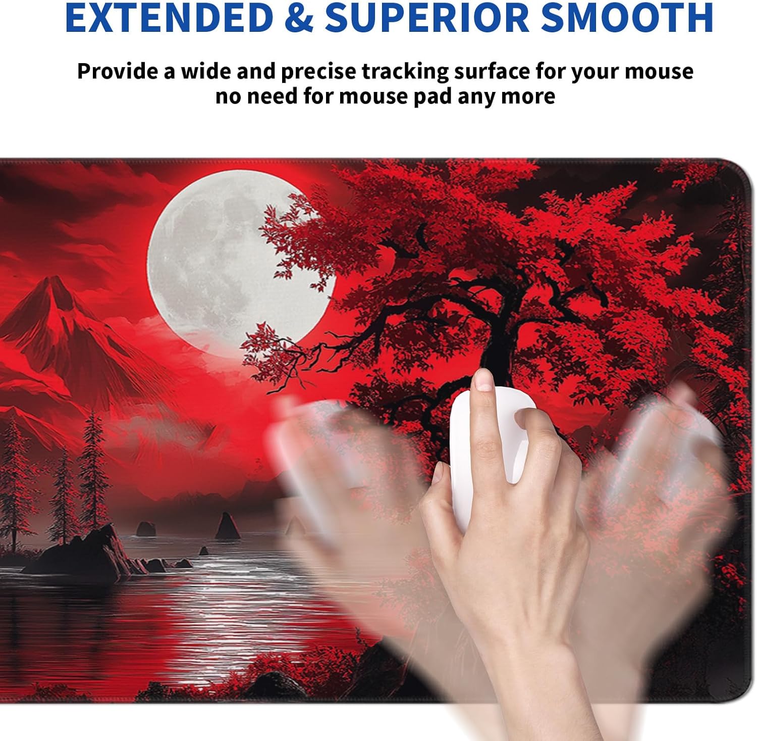 - β₯[Large and Perfect Size]:The extended Darkness Red Moon desk pad measures 31.5x11.8x0.12 inches that covers most of the desk.The desk pad is large enough to have a mouse, gaming keyboard, and other desk items while maintaining protecting your desk all the time.You can freely move your mouse without any interruption and don't have to continually adjust the mat as you do with traditional mousepads.