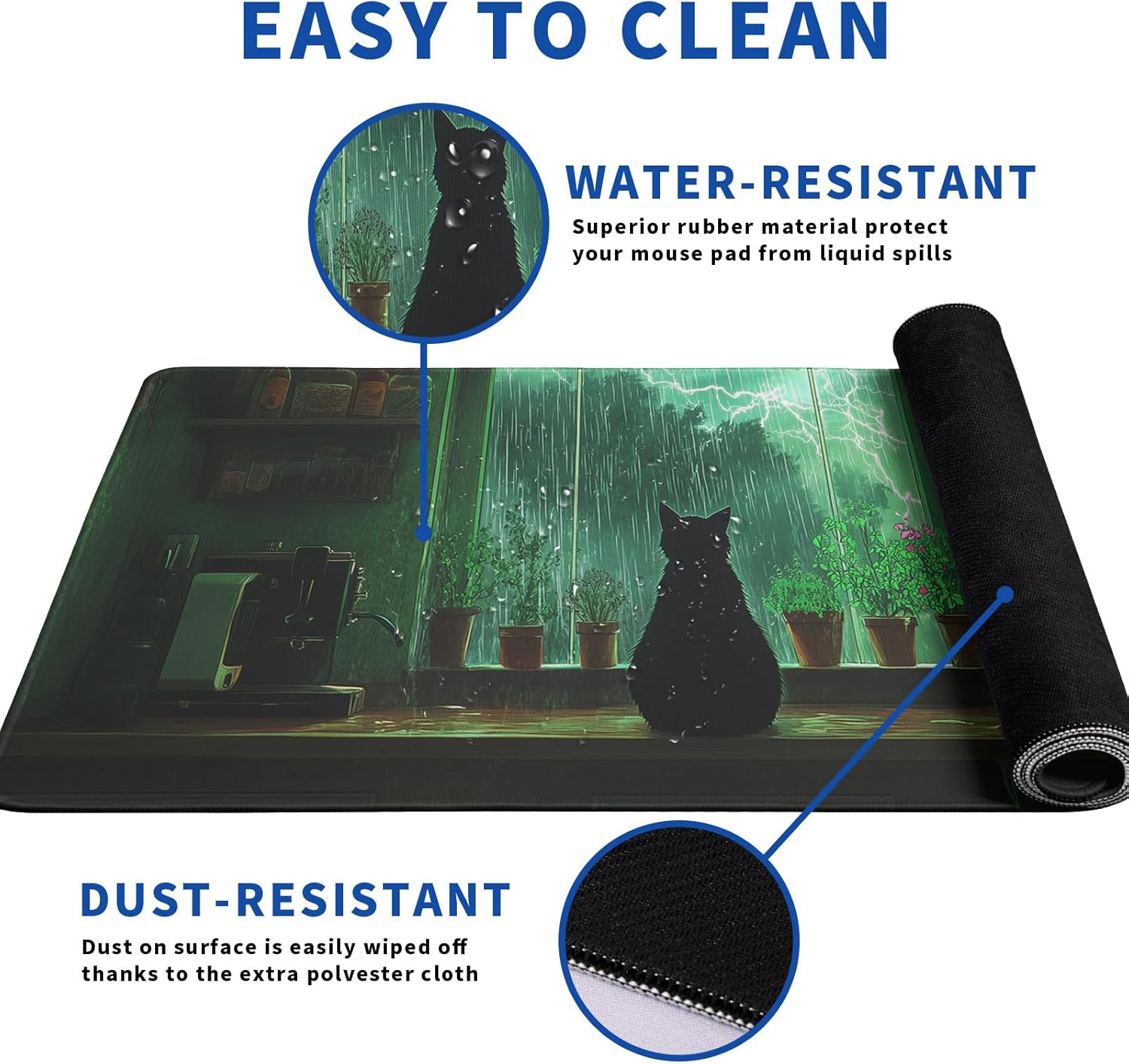 - β₯[Easy To Clean]:This large Green Black Cat mouse pad for desk, Spill-proof coating protects your desktop from spilled water, Drinks, Ink and the other liquid spilled liquid or other accidents. Easy to clean, Just wipe with a wet cloth or paper, Does not fade and can be washed and foldable without leaving creases, Easy to carry.