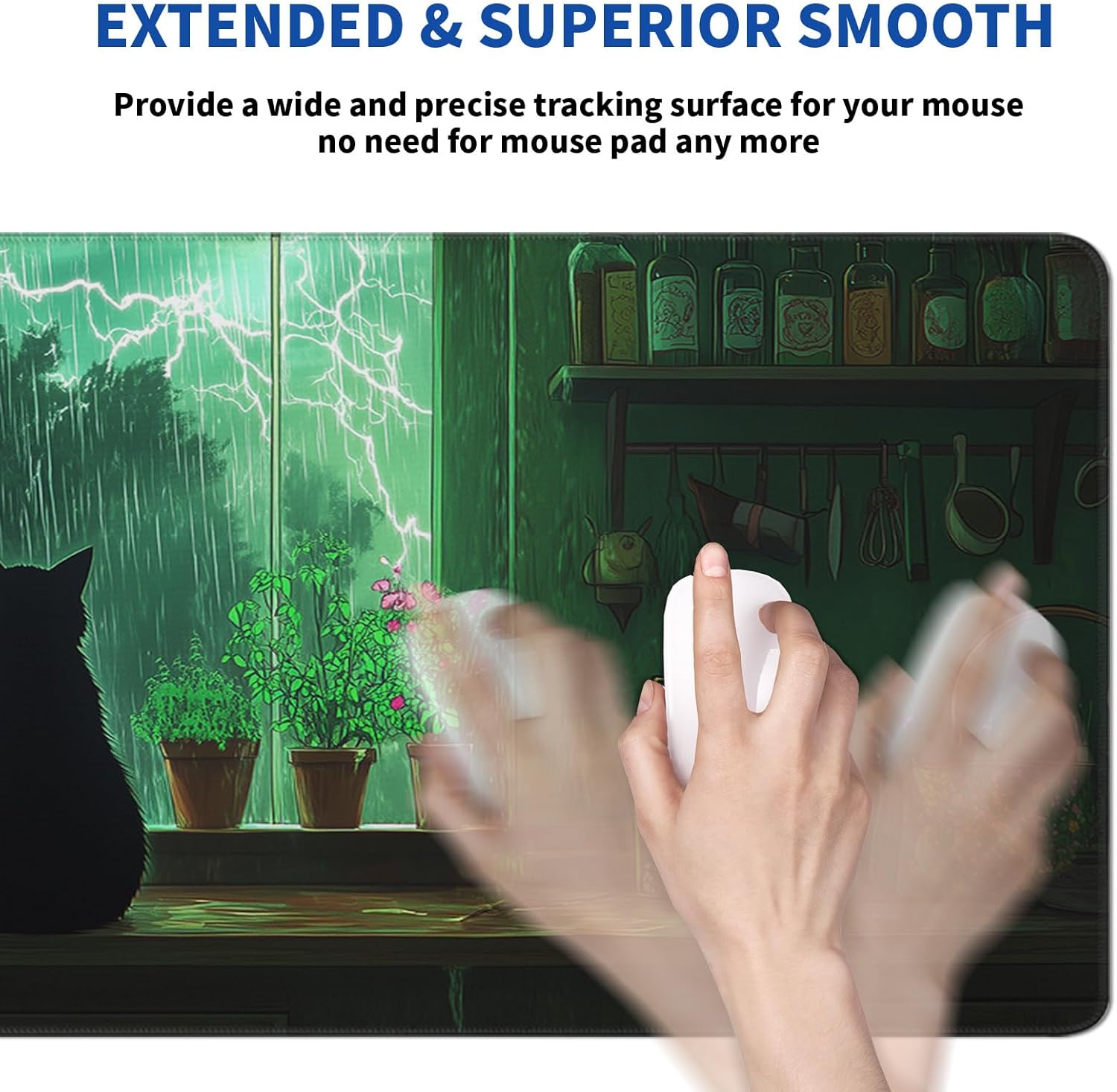 - β₯[Large and Perfect Size]:The extended Green Black Cat desk pad measures 31.5x11.8x0.12 inches that covers most of the desk.The desk pad is large enough to have a mouse, gaming keyboard, and other desk items while maintaining protecting your desk all the time.You can freely move your mouse without any interruption and don't have to continually adjust the mat as you do with traditional mousepads.