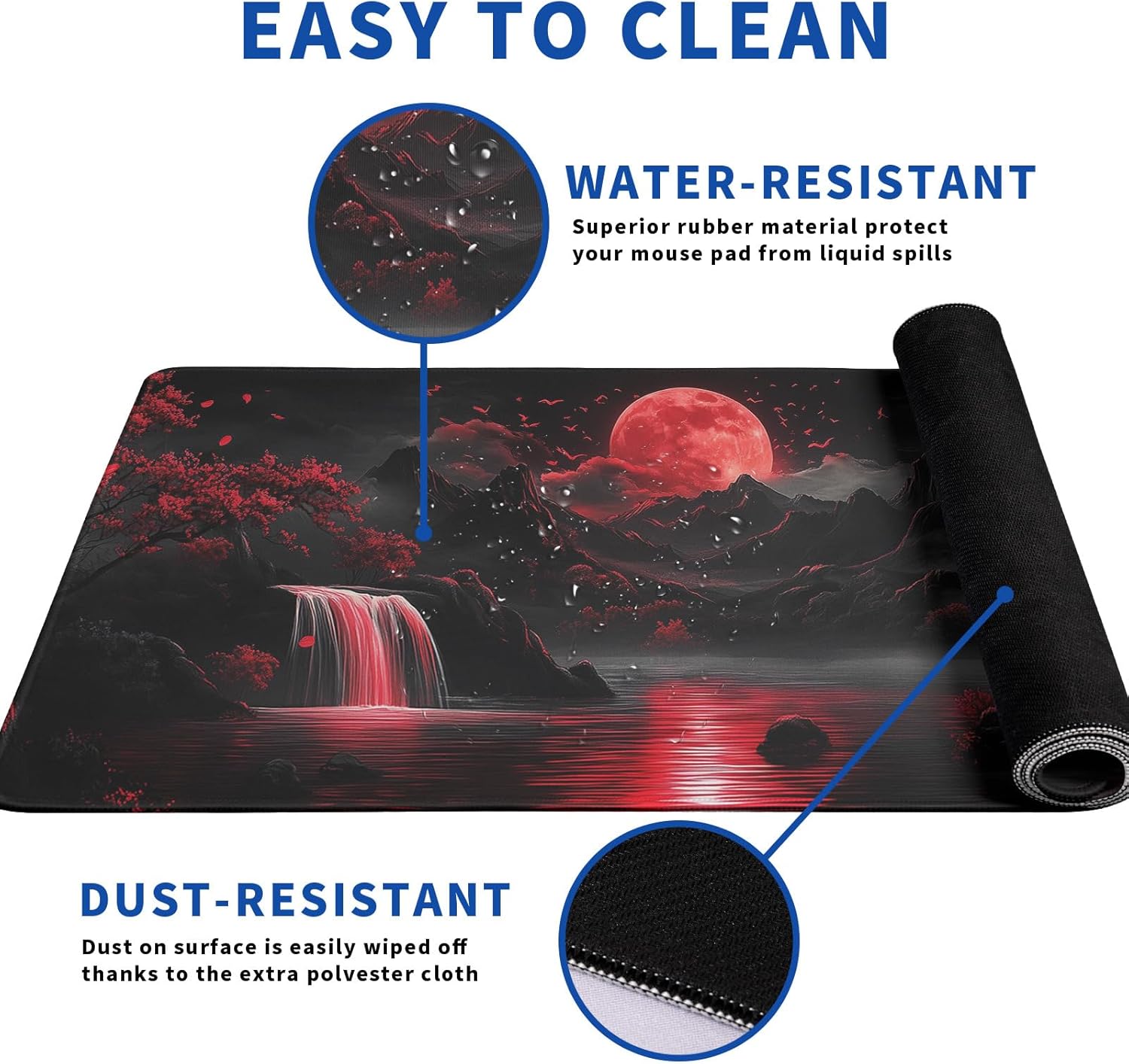 - β₯[Easy To Clean]:This large Darkness Red Moon mouse pad for desk, Spill-proof coating protects your desktop from spilled water, Drinks, Ink and the other liquid spilled liquid or other accidents.Easy to clean, Just wipe with a wet cloth or paper, Does not fade and can be washed and foldable without leaving creases, Easy to carry.