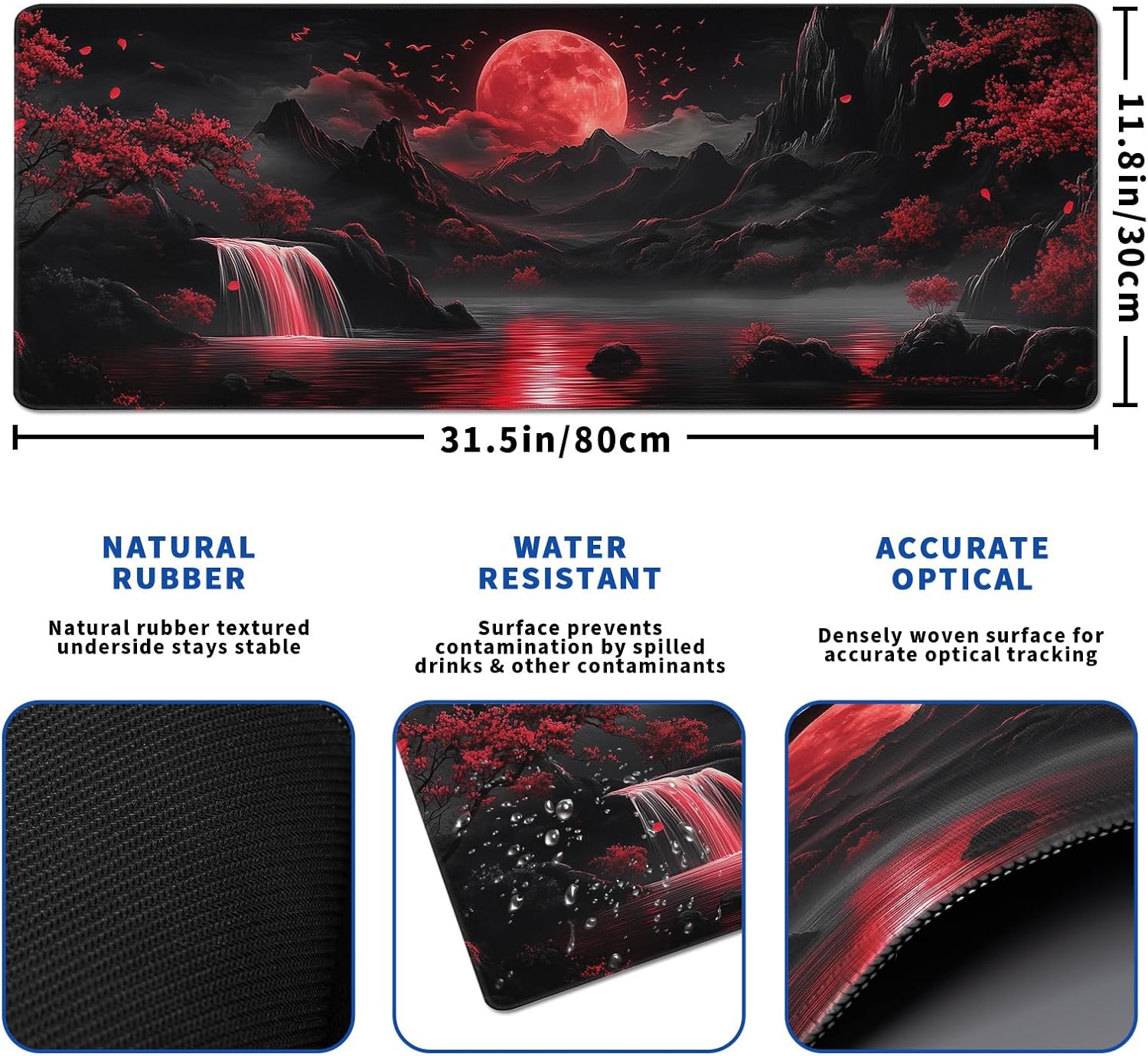 - β₯[Large and Perfect Size]:The extended Darkness Red Moon desk pad measures 31.5x11.8x0.12 inches that covers most of the desk.The desk pad is large enough to have a mouse, gaming keyboard, and other desk items while maintaining protecting your desk all the time.You can freely move your mouse without any interruption and don't have to continually adjust the mat as you do with traditional mousepads.