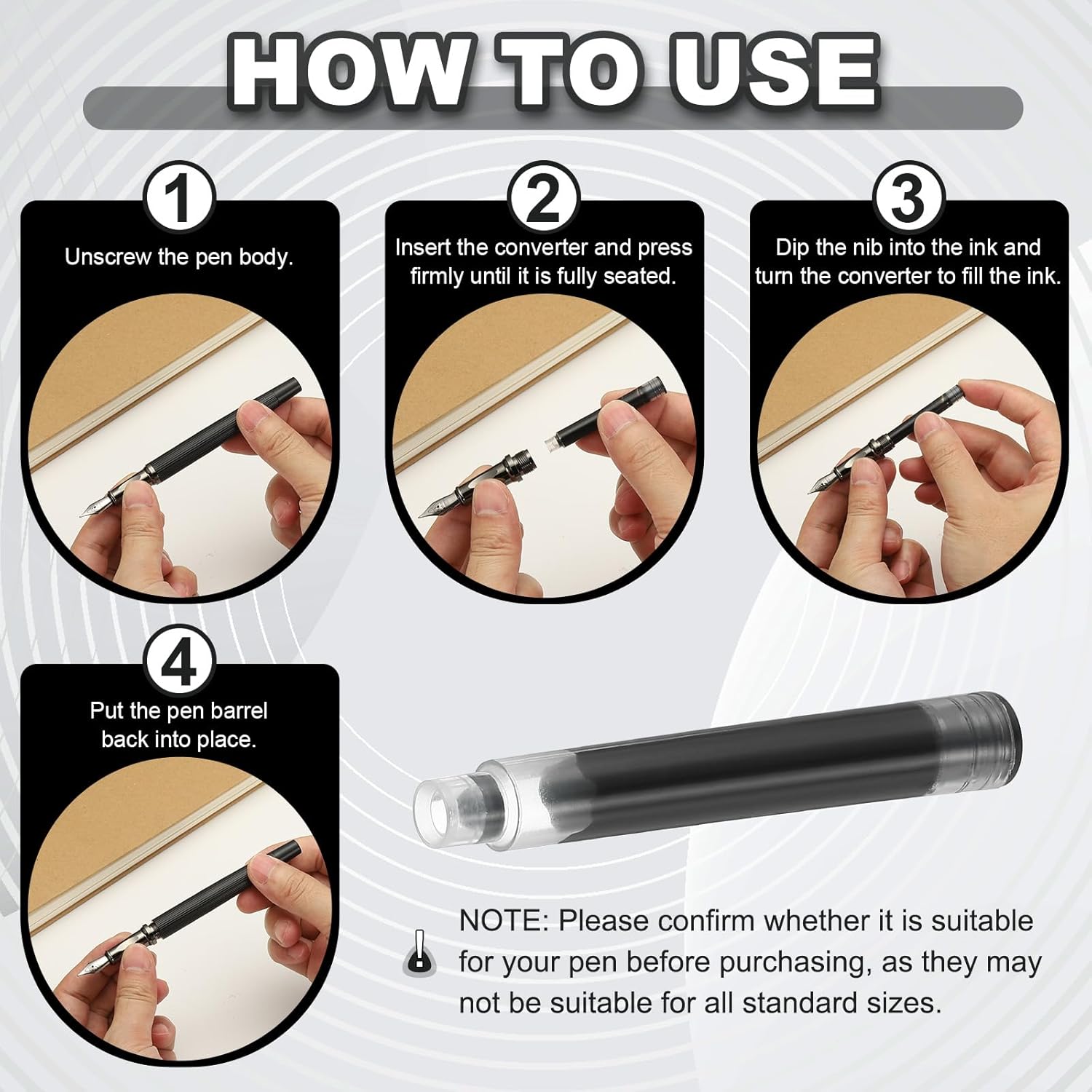 - Instruction: For installation, remove the pen cap, pen barrel, and ink converter. Gently align the narrow end of the ink with the pen tip and press firmly until you hear a click. Once installed, gently shake the pen to promote ink flow and start writing smoothly.