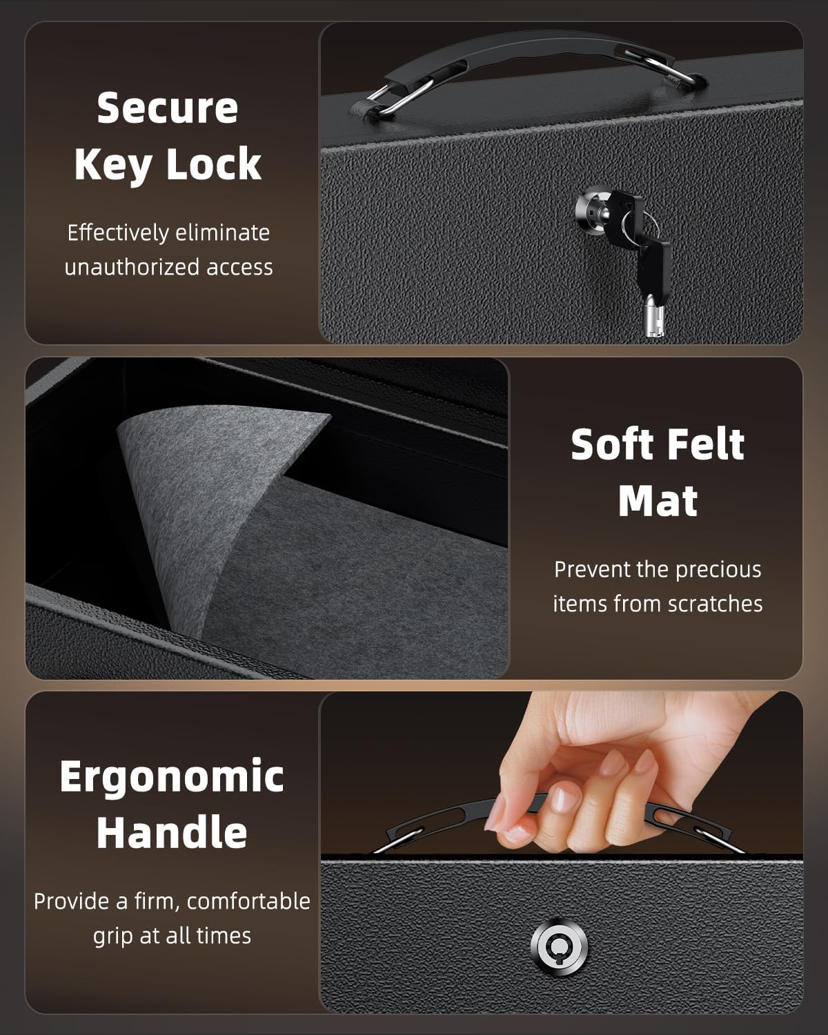 - Essential Safe Box: A smart way to safeguard all your critical belongings, including contracts, passports, social security cards, business cards, jewelry, cash, and keys. Enjoy peace of mind at home, at work, or on the go