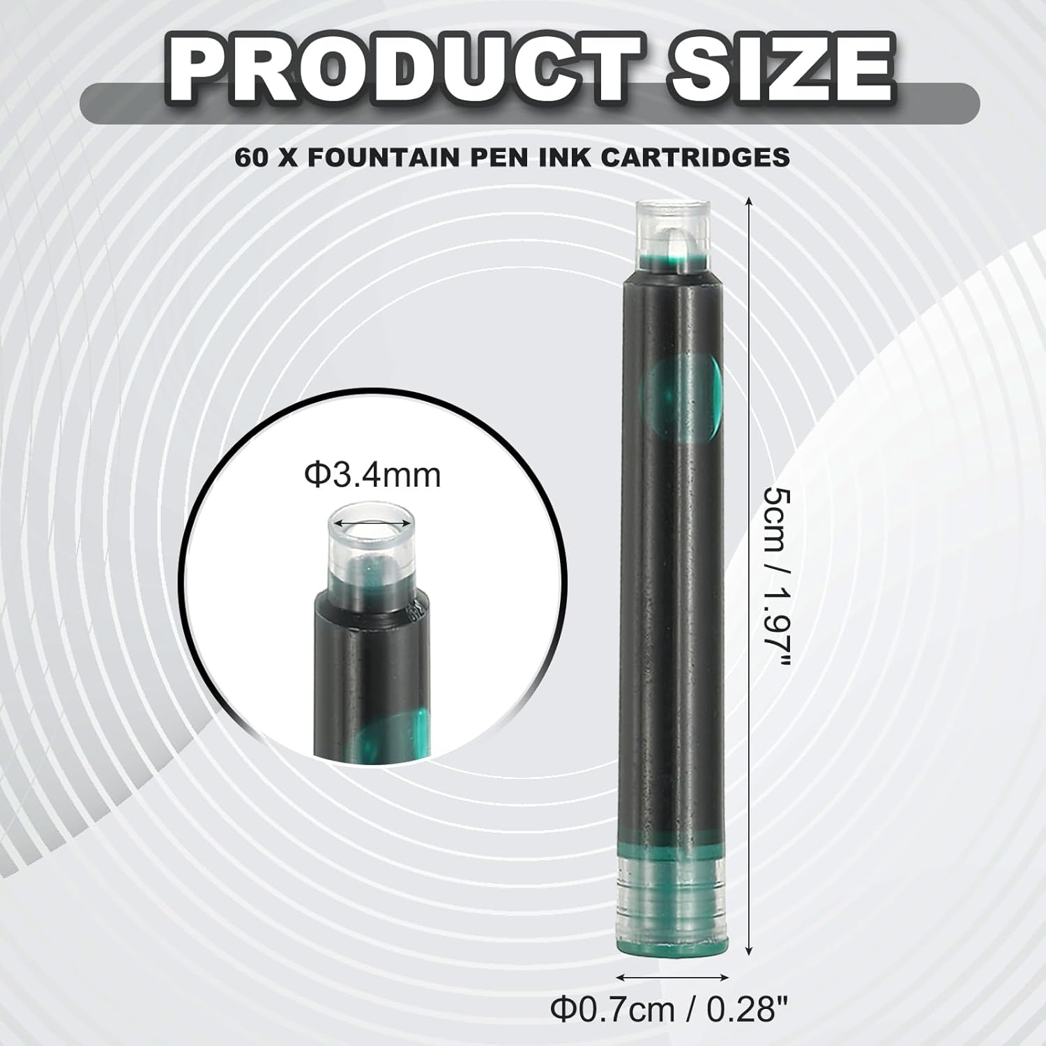 - Specifications: Material: Plastic; Ink Color:Dark Green; Ink Refill Size: 5 x 0.7cm / 1.97 x 0.28 inch ( L * Dia ); Inner Diameter: 3.4mm; Packing List: 60 x Fountain Ink Refill
