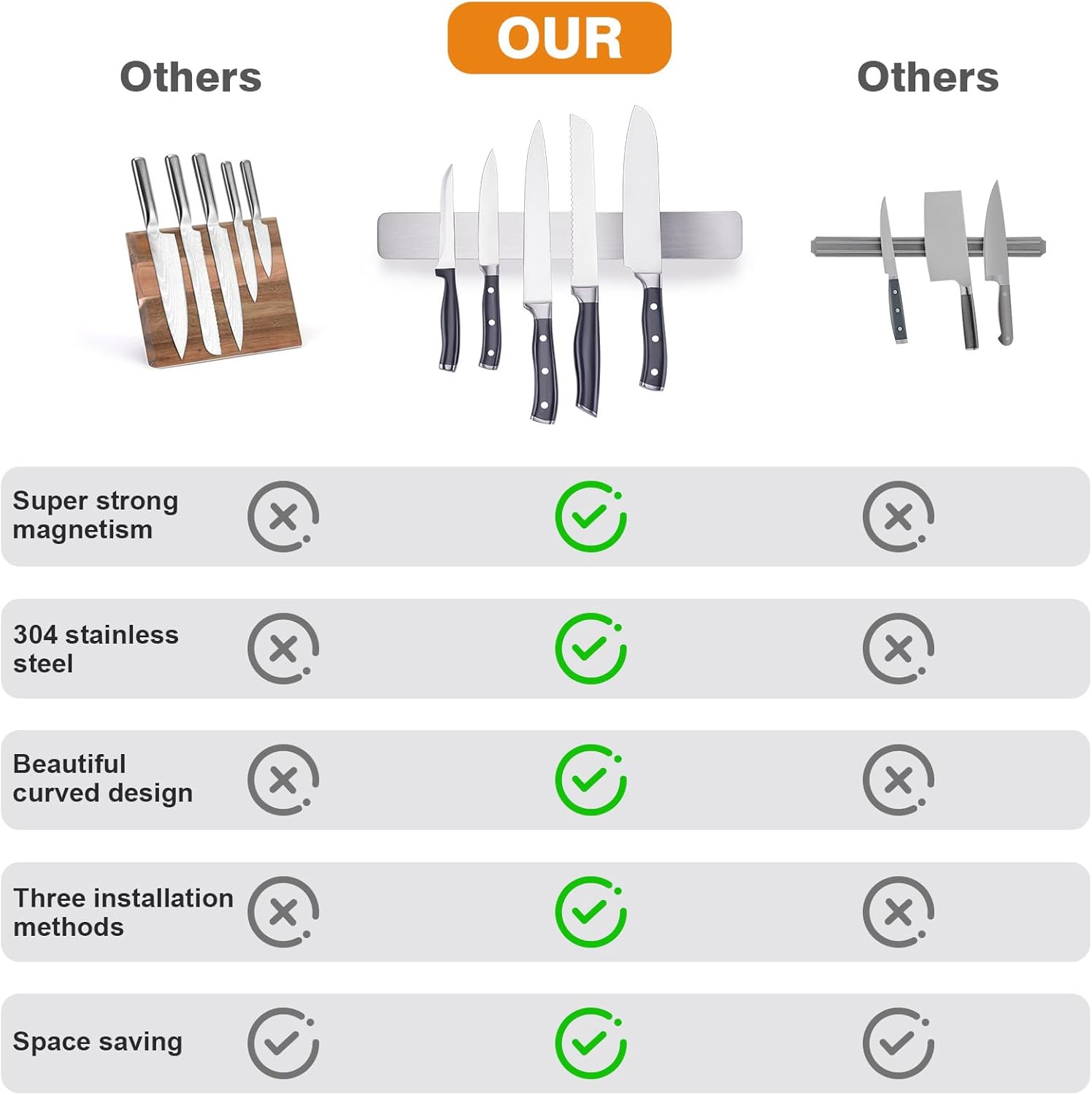 - Multi-Use Organizer for Any Space:Not just for knives—use it to organize scissors, kitchen utensils, tools, or craft supplies. With its extended magnetic surface, it offers more capacity than many traditional knife blocks while still fitting neatly in compact spaces.