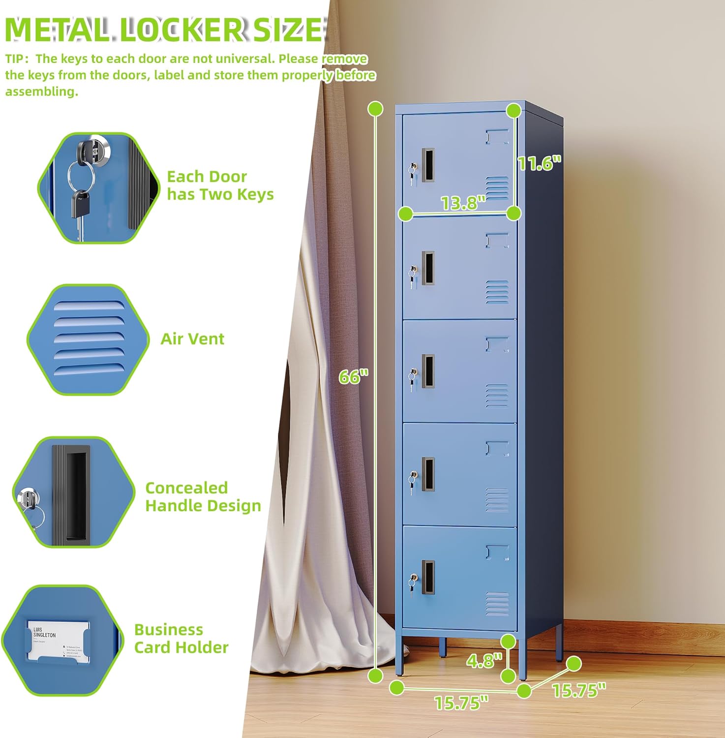 - Sleek Blue Aesthetic:This 5 door metal storage locker in a stylish blue color not only offers secure storage but also adds a modern touch to any home, office, or gym environment. With dimensions of 66.18"H×15.75"W×15.75"D, it provides ample space without taking up too much floor area.