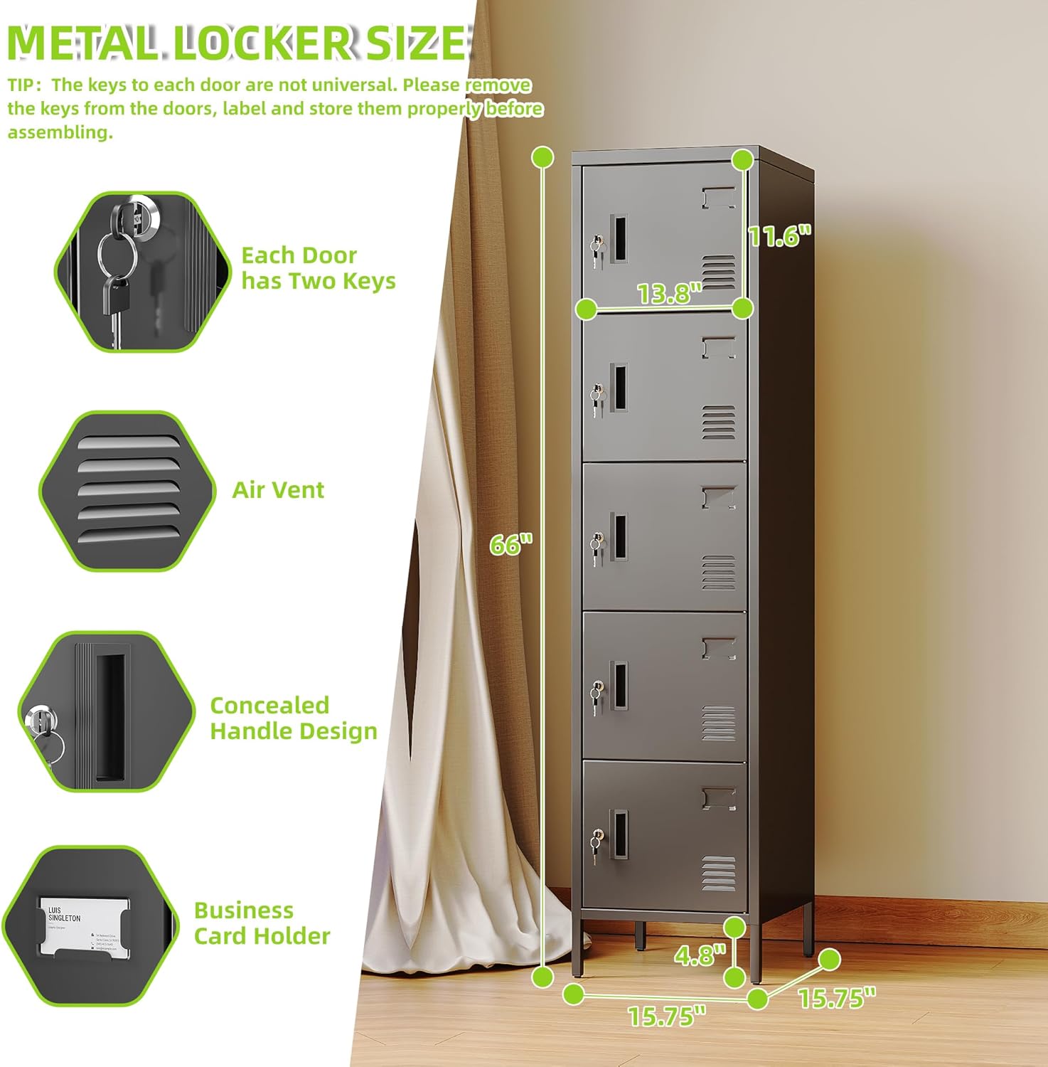 - Sleek Black Aesthetic:This 5 door metal storage locker in a stylish black color not only offers secure storage but also adds a modern touch to any home, office, or gym environment. With dimensions of 66.18"H×15.75"W×15.75"D, it provides ample space without taking up too much floor area.