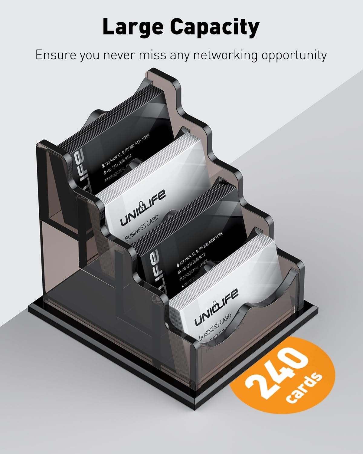 Uniclife Acrylic Business Card Holder for Desk 4 Slots Horizontal Business Card Display Stand for Men and Women Desktop Name Card Organizer Card Stand for Office Home, 240 Card Capacity, Black