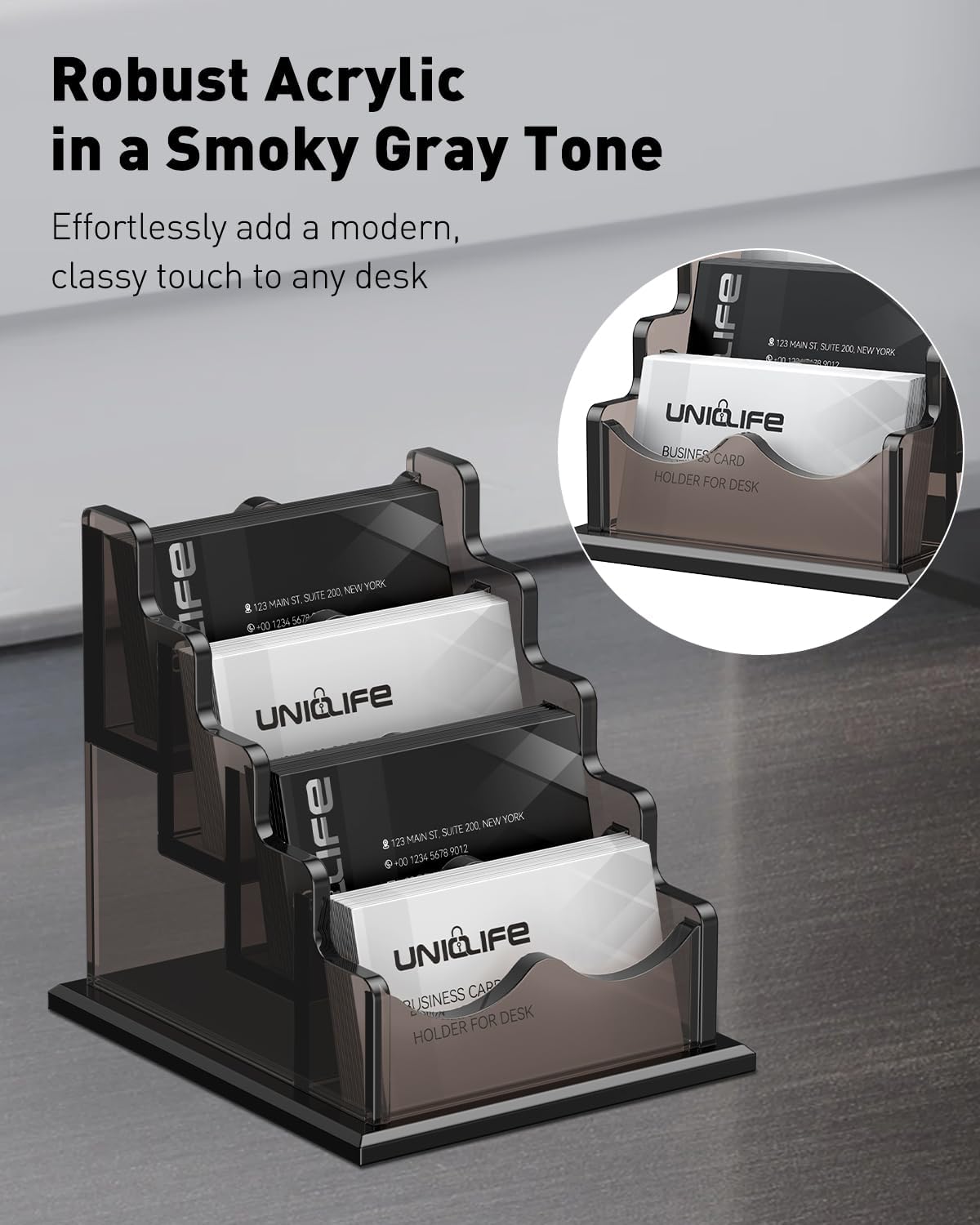 - 5 mm Thickened Acrylic: Crafted from reliable acrylic, the business card display stand combines sleek translucency with exceptional sturdiness. The smoky gray tone creates a modern, classy look, bringing elegance and functionality to your desk