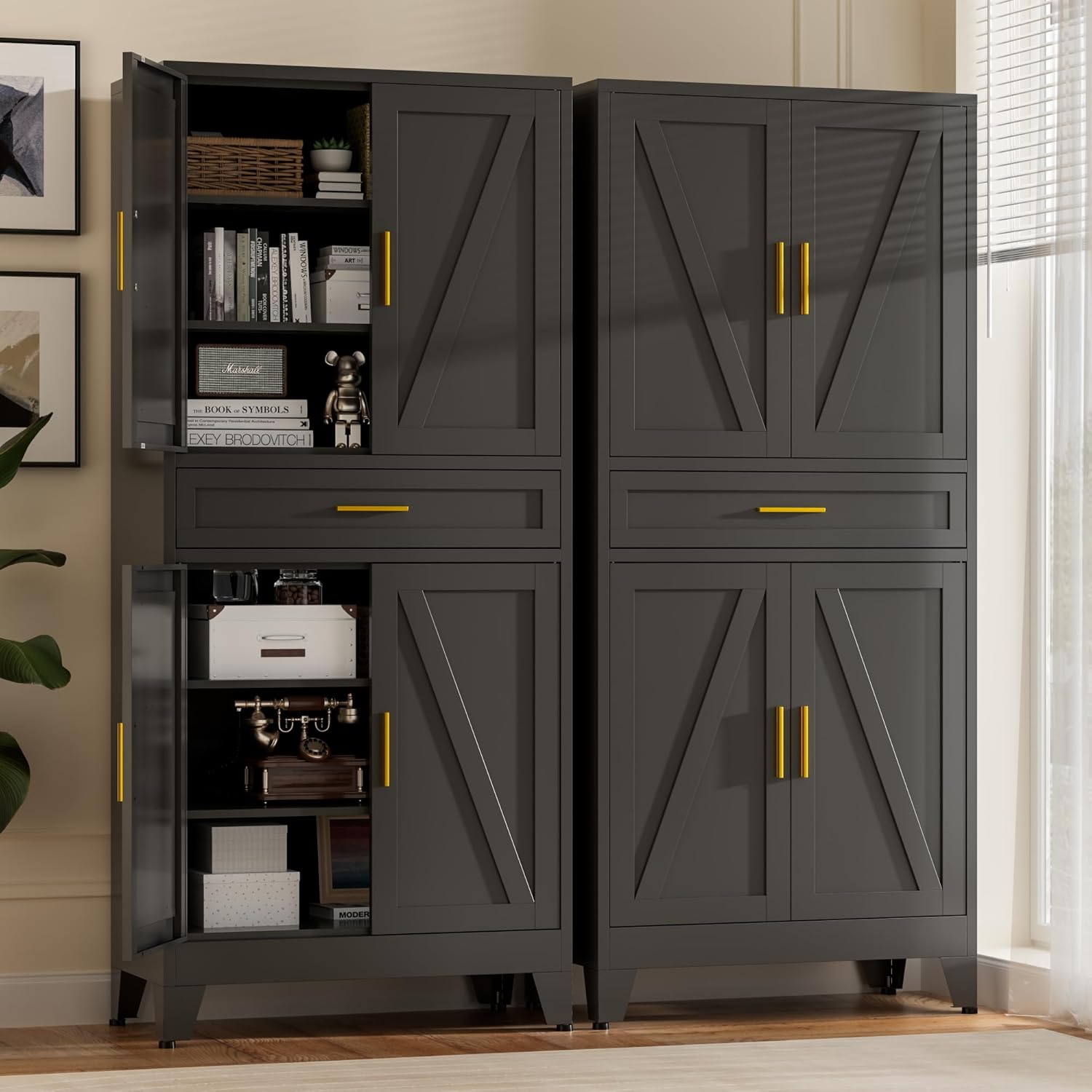 - All-matching Farmhouse Elegance: Our tall kitchen pantry cabinet features a sleek rectangular silhouette with 2 classic barn doors.The metal storage cabinet with whole-in-one reinforced heavy gauge steel deluxe welded frame,masterfully fuses modern rustic aesthetics with the warmth of vintage farmhouse charm.It effortlessly breathes personality and grace into your kitchen,office or dining room, seamlessly complementing any furniture and decor style you embrace