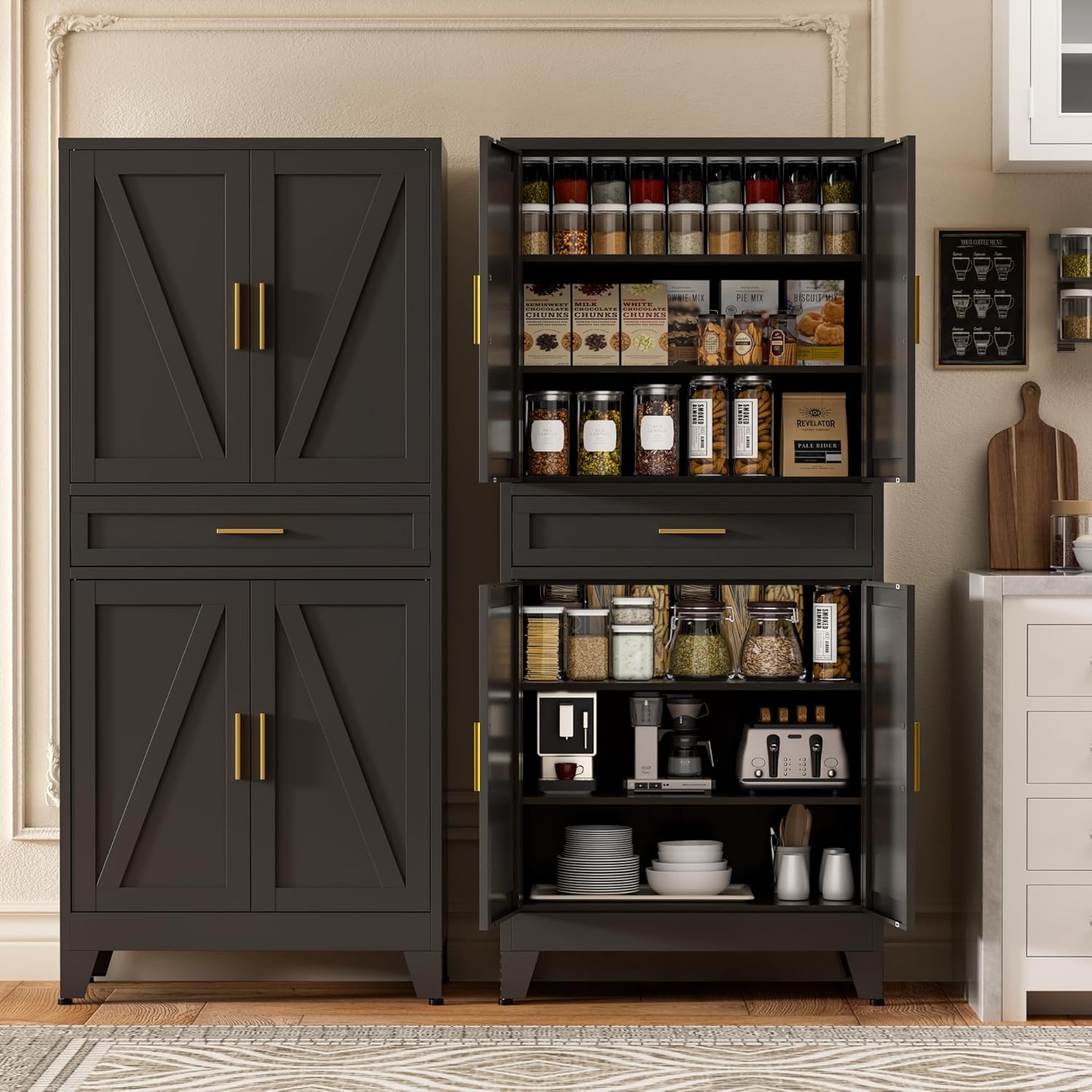 71" Tall Metal Storage Cabinet with Drawer and Adjustable Shelves,Farmhouse Kitchen Pantry Storage Cabinet with Doors,Large Wide Cabinets for Craft Room,Office,Dining Room,Bathroom(Black)