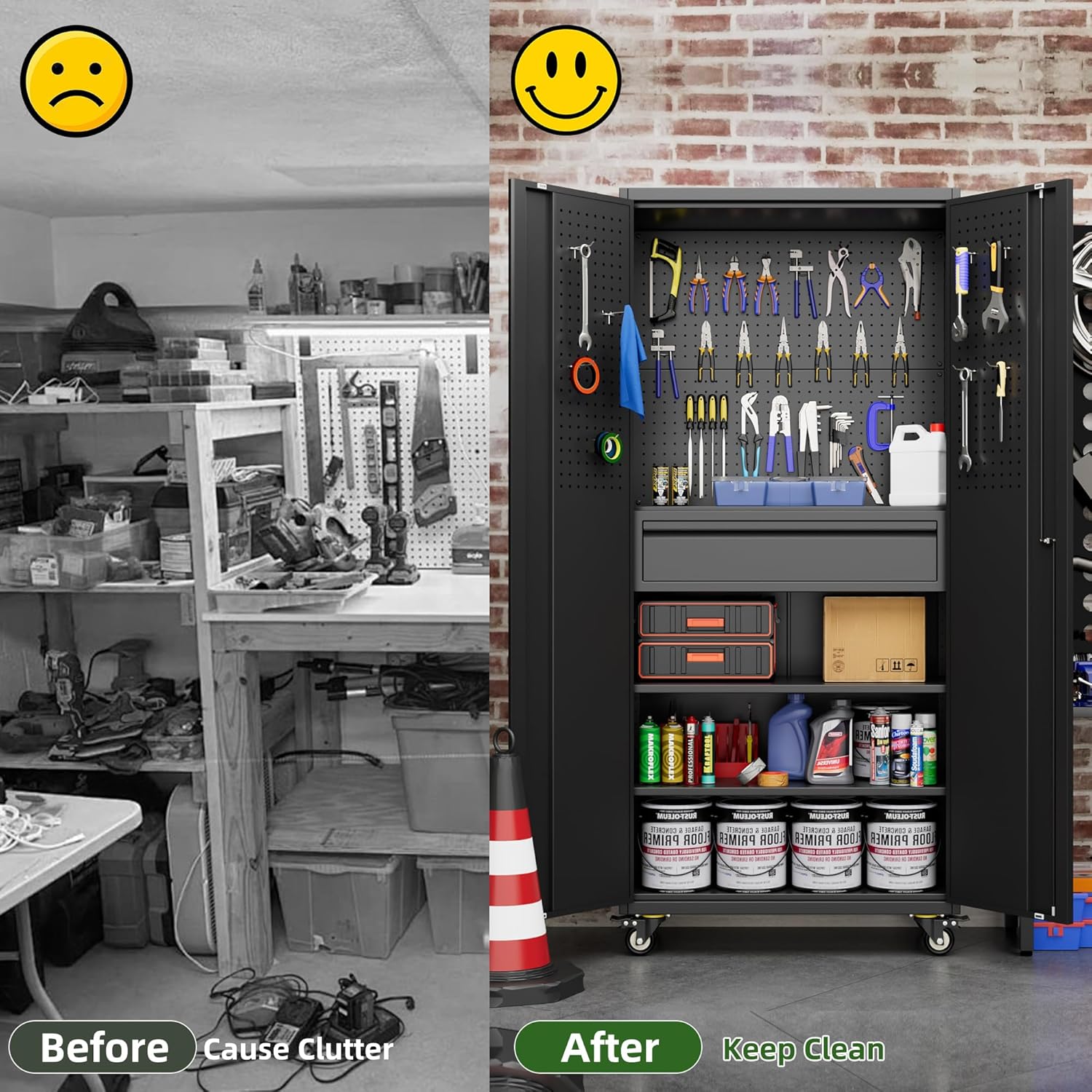 - 【1 Storage Drawer】Garage Tool storage cabinet with Wheels has 1 drawer in the cabinet to protect your private items. You can store important documents in it. The drawer is carried by two silent tracks, allowing for comfortable pulling.