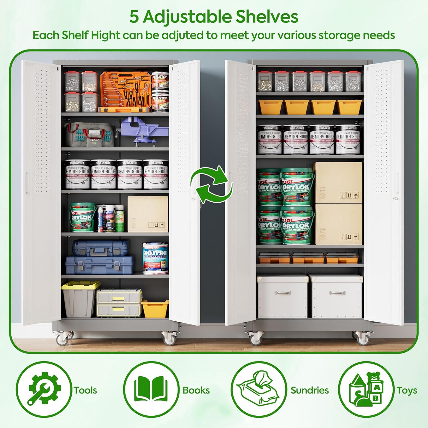 - [Adjustable Shelves&Large Weight Capacity] The metal storage cabinet with wheels has 5 adjustable and removable shelves, which can offer you flexible space. Each shelf of the storage cabinet on wheels can hold up to 120lbs. you can add lighting by yourself on top of the cabinet if it was dark where you keep it.