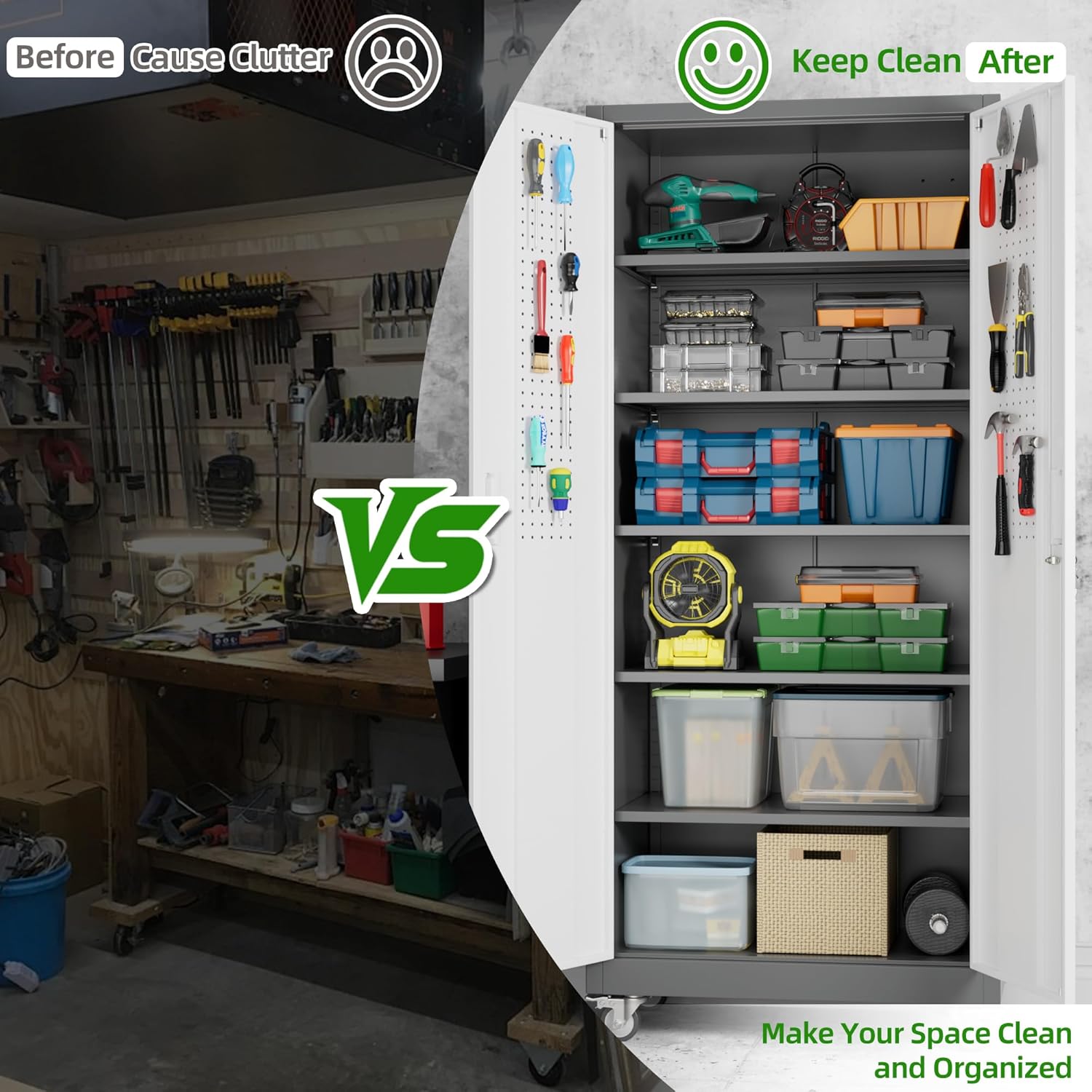 - [Garage Storage Cabinet] Plenty of storage. "great garage cleanup".You can move them around as needed and the casters and wheels work great on all the different surfaces inyour garage. Extra storage strong and fit your needs, it is sufficient for garage use.