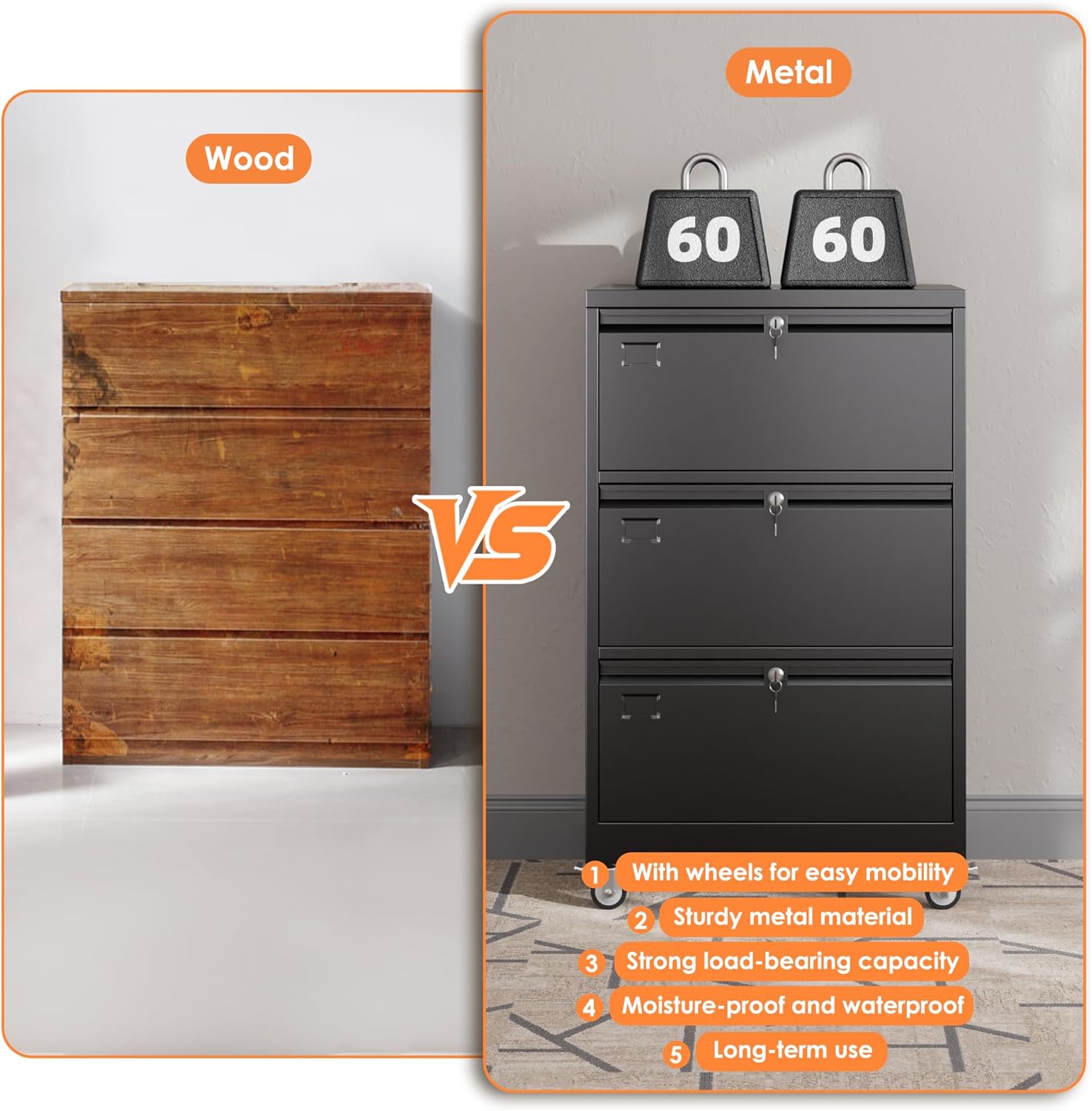 Aobabo 3 Drawer Lateral File Cabinet with Wheels,Metal Filing Cabinet with 3 Lock, for Home Office School Hanging Files Letter/Legal/F4/A4 Size, Assembly Required, Black