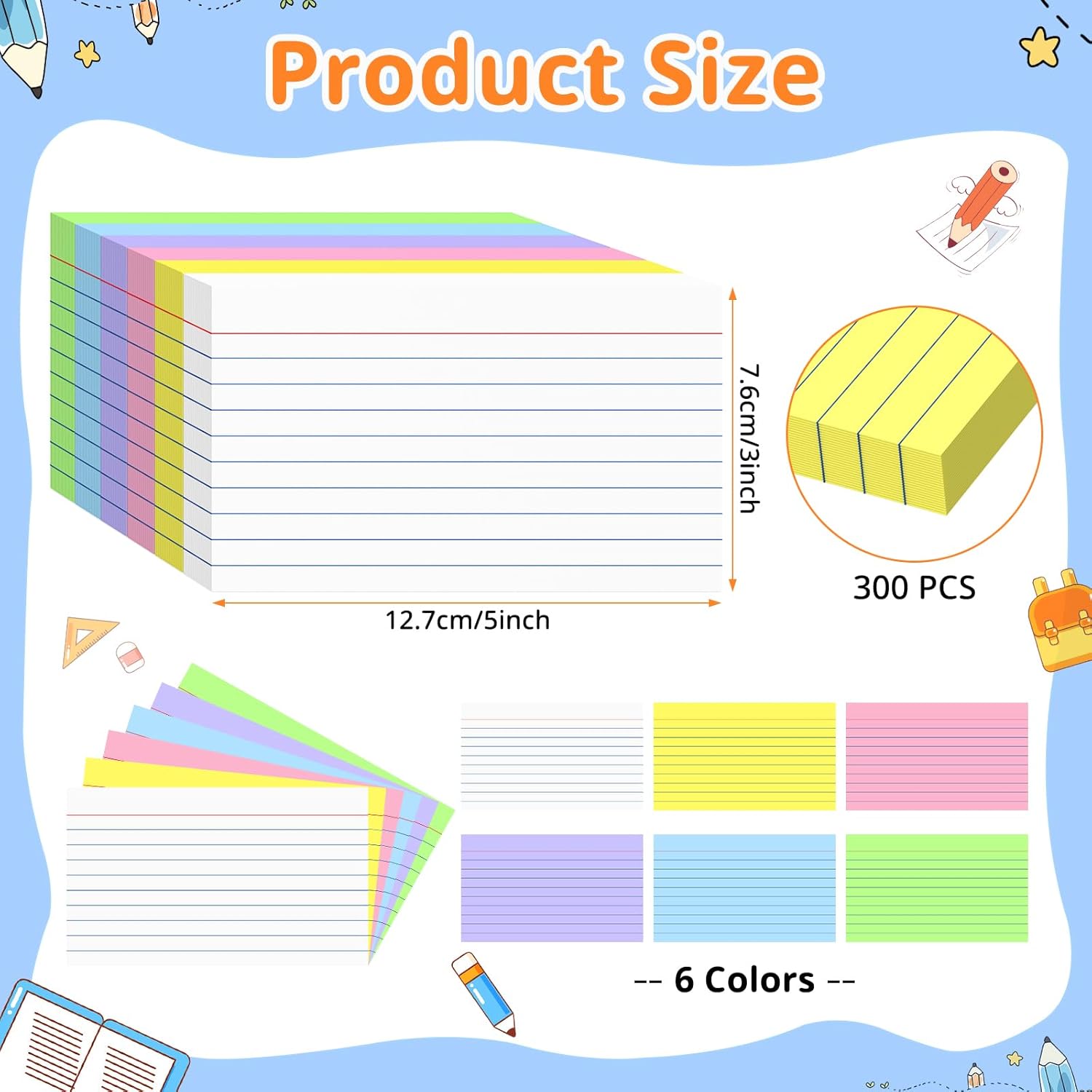 Colored Index Cards 3 X 5, 300 Count, Flash Cards For Studying, Lined Flashcards Notecards, Study Card, Ruled Front And Blank Back, Heavy Note Cards For Office, Home And School