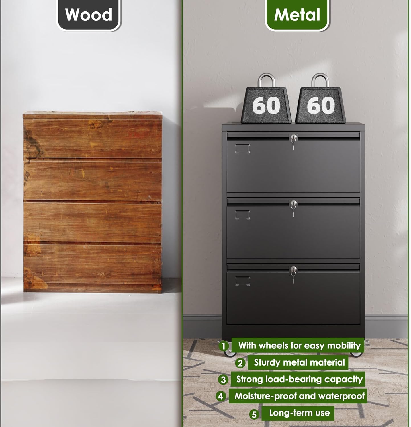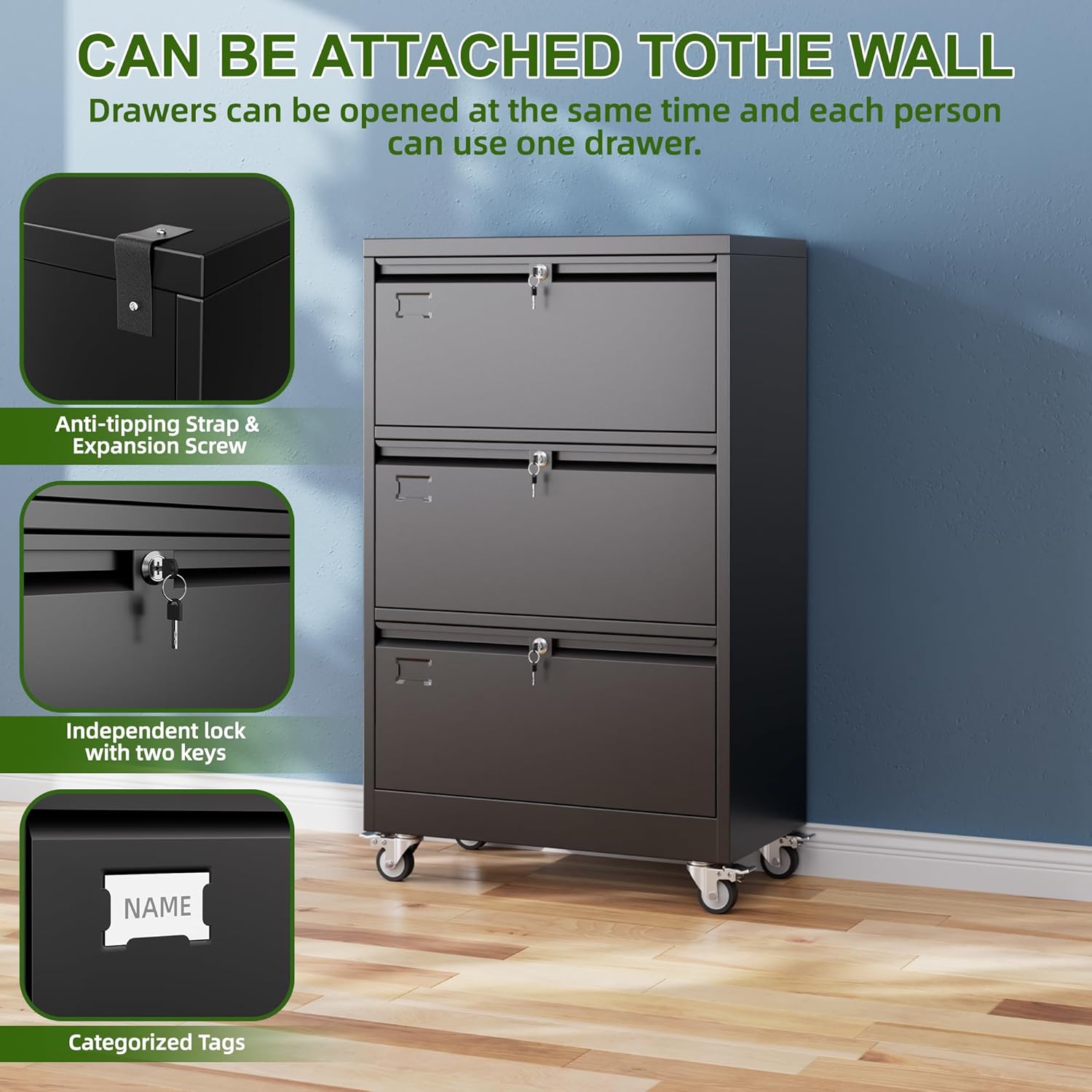 - [All-steel Stable-Rustproof] 3 drawer file cabinet with wheels has a reinforced steel frame with a corrosion and stain-resistant powder coat, Rugged and not easily deformed,which is ideal for long-term use.