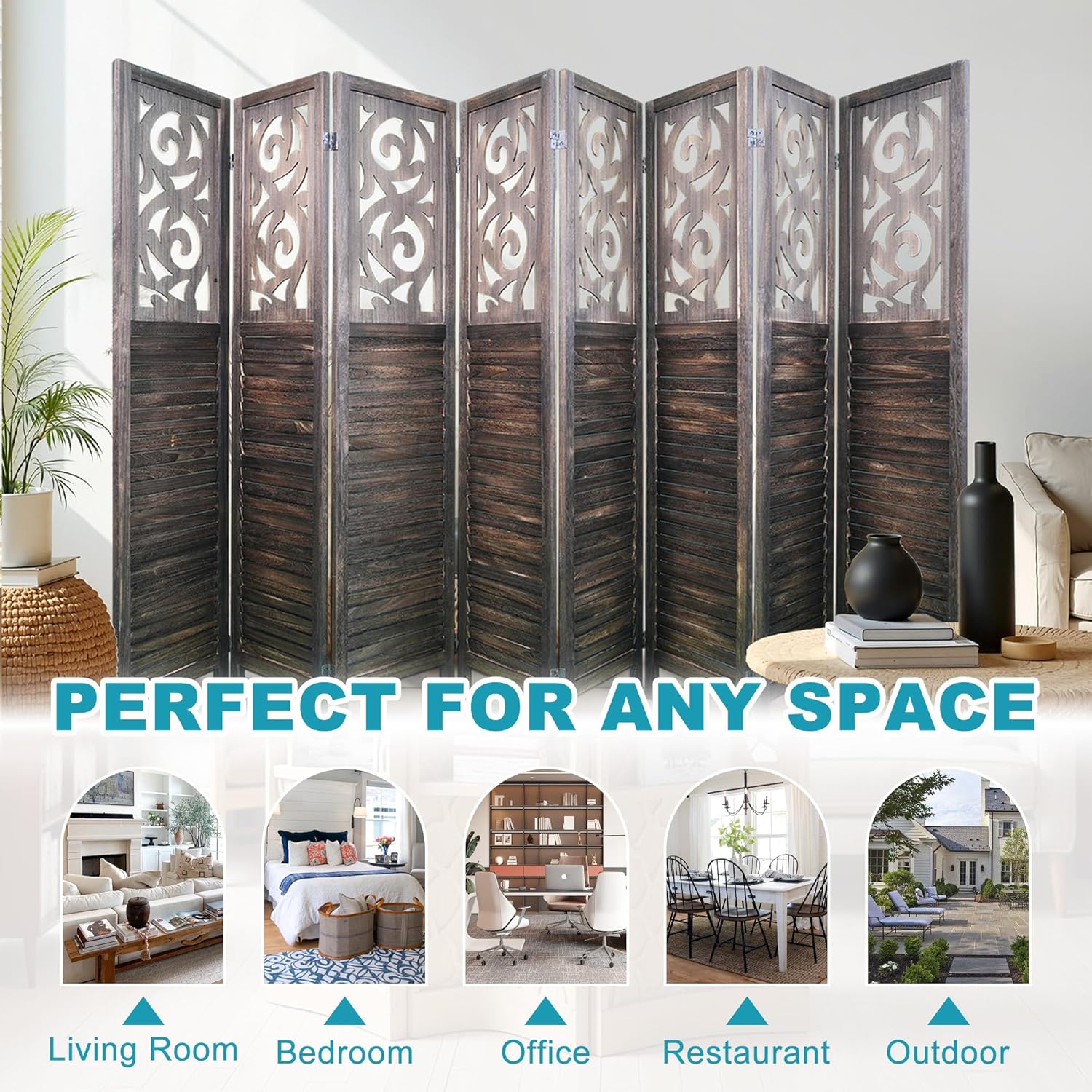 - Elegant Carved Design: Featuring intricate carved patterns, this room divider blends style and function. Perfect as a wall divider, room separator, or privacy screen, it enhances your décor while providing privacy.