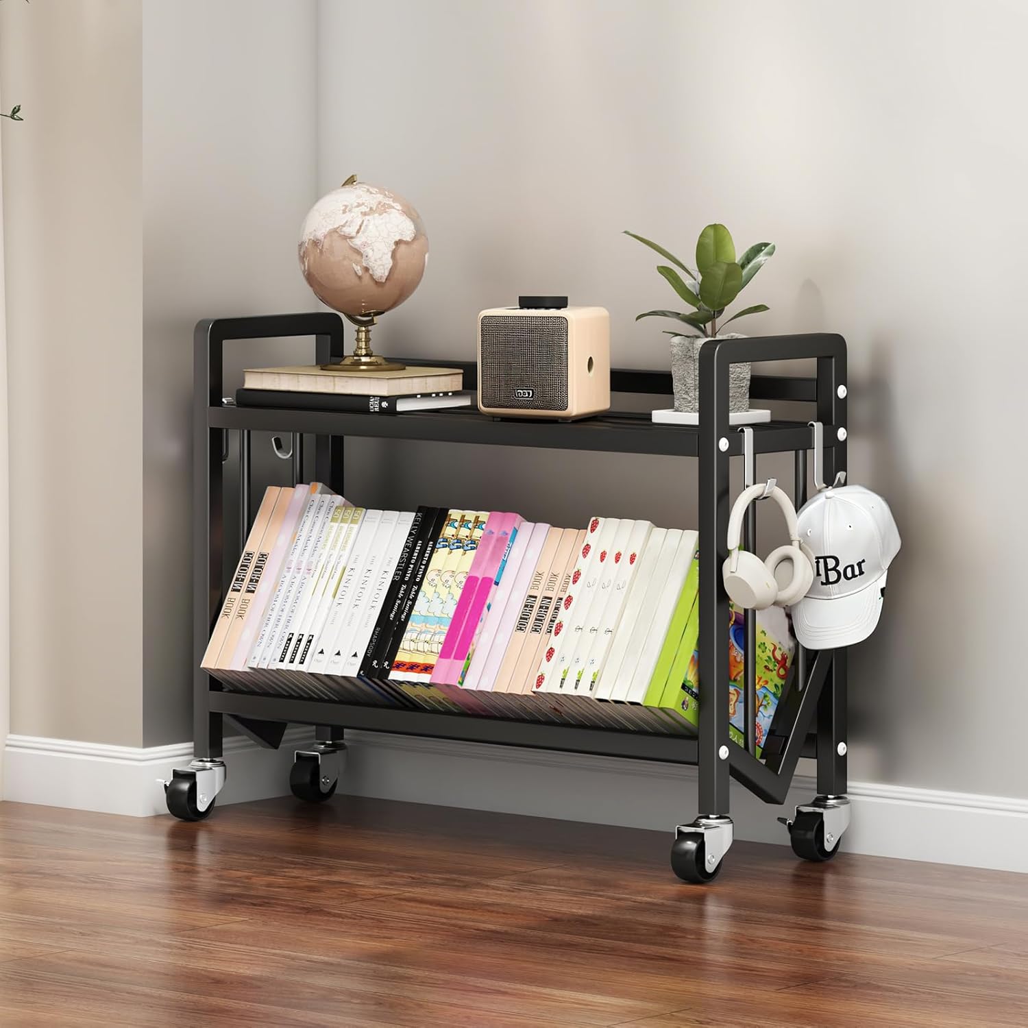 Bookshelf Movable Book Cart Multi-Layer Storage Rack Large-Capacity Rolling Cart L-Shaped Carbon Steel Shelf Suitable for Storing Books, Magazines, Newspapers, Shoes