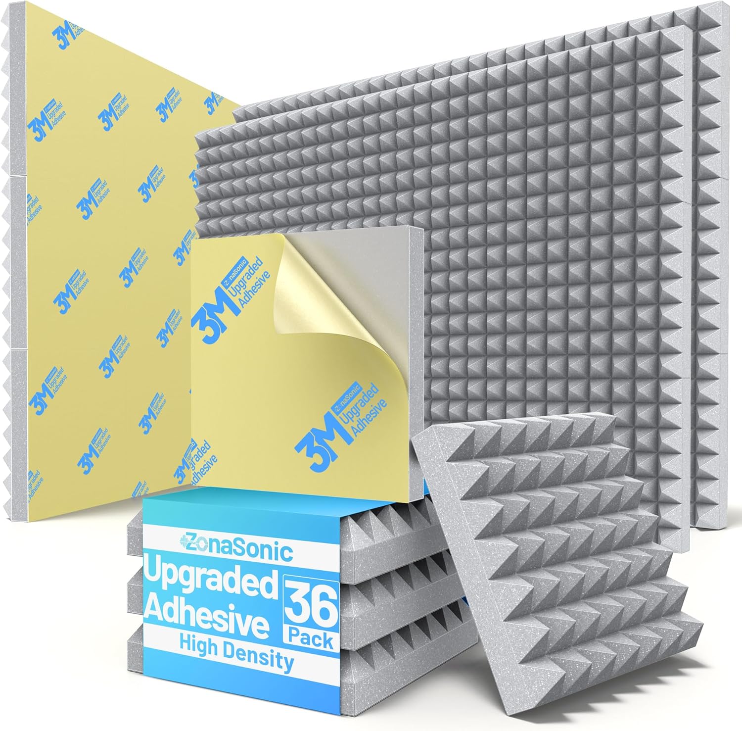 36 Pack Pyramid Sound Proof Foam Panels for Walls with Updated Self-Adhesive 3"X12"X12" High Density Acoustic Panels Sound Absorbing Fast-Expanding Soundproof Wall Panels for Gaming Studio Decor- Gray