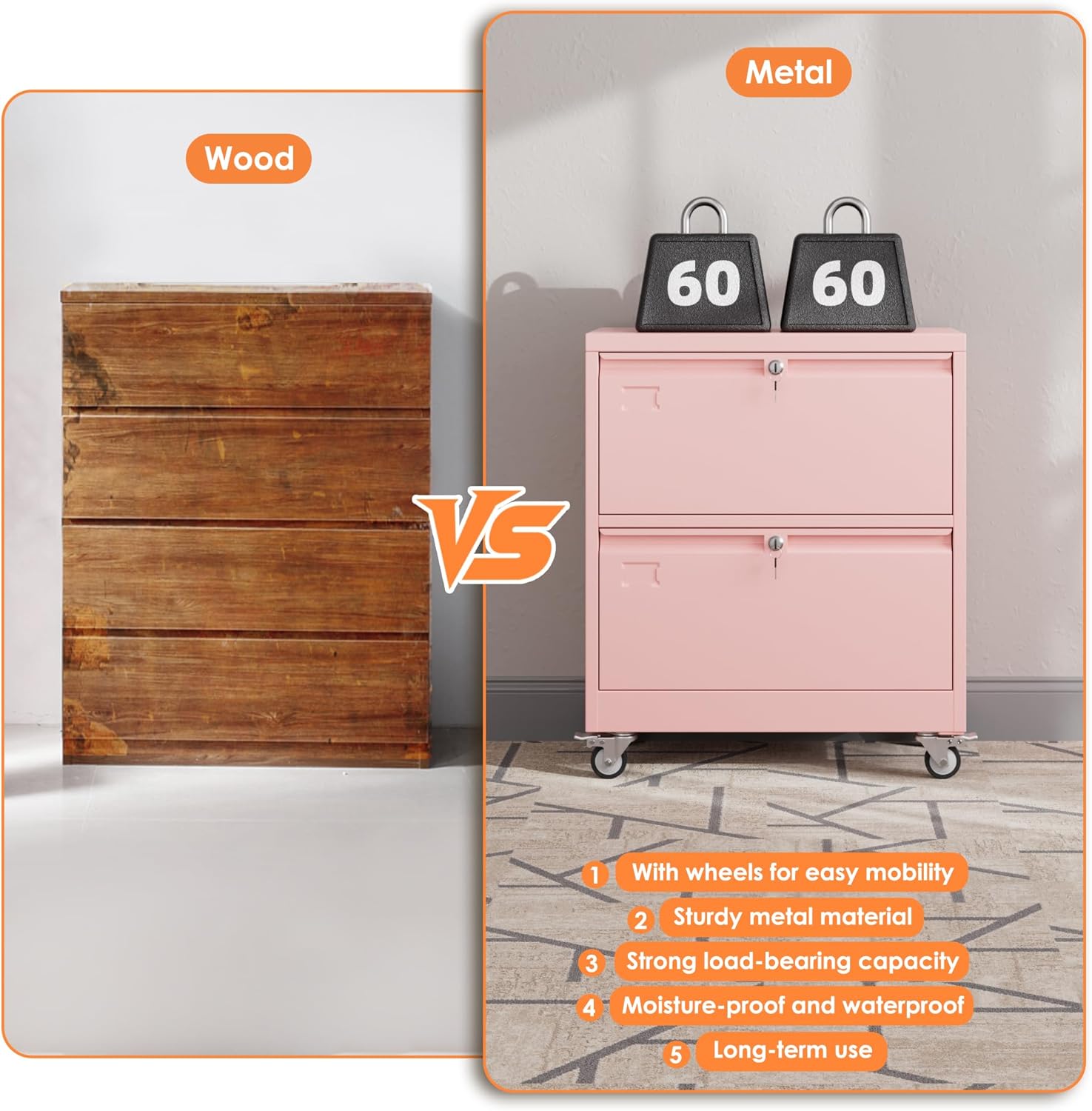METAN Upgrade 2 Drawers Lateral File Cabinet on Wheels,Steel Office Filing Storage Cabinet with 2 Locks,Assembly Required,Pink