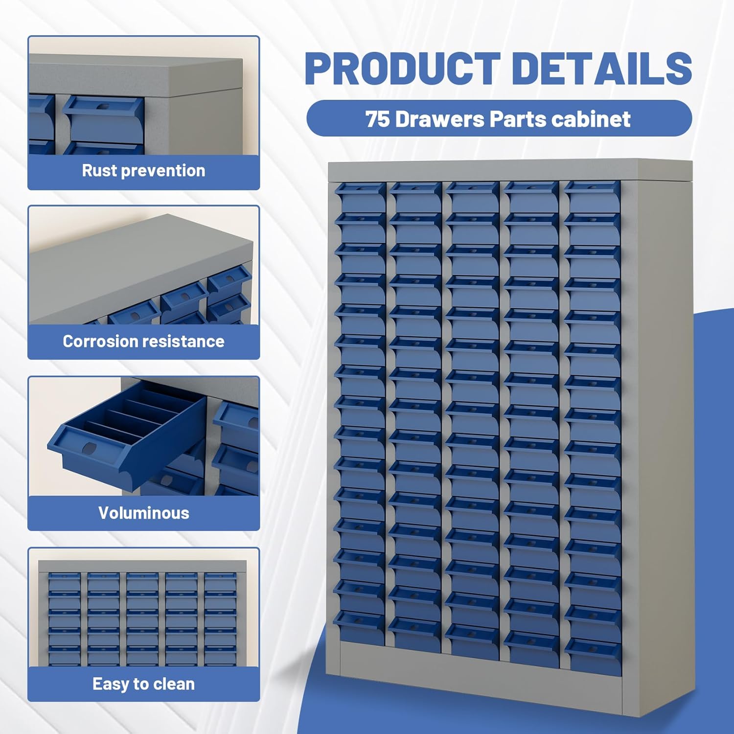 - â ă75 Drawers Large CapacityăThis parts cabinet features 75 drawers (8.39Ă3.62Ă1.97 inch each) in a compact frame (23.22Ă8.46Ă34.45 inch), perfect for organizing thousands of small items. Each drawer is equipped with anti-slip stops to prevent accidental falling.